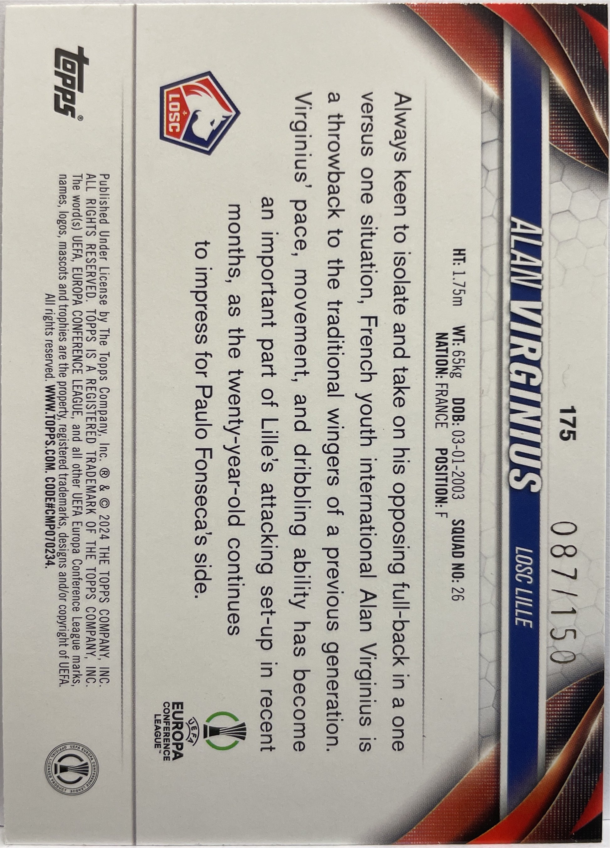 Alan Virginius 87/150 Rookie Black and White Icy Topps UCC 2023/24 Losc Lille