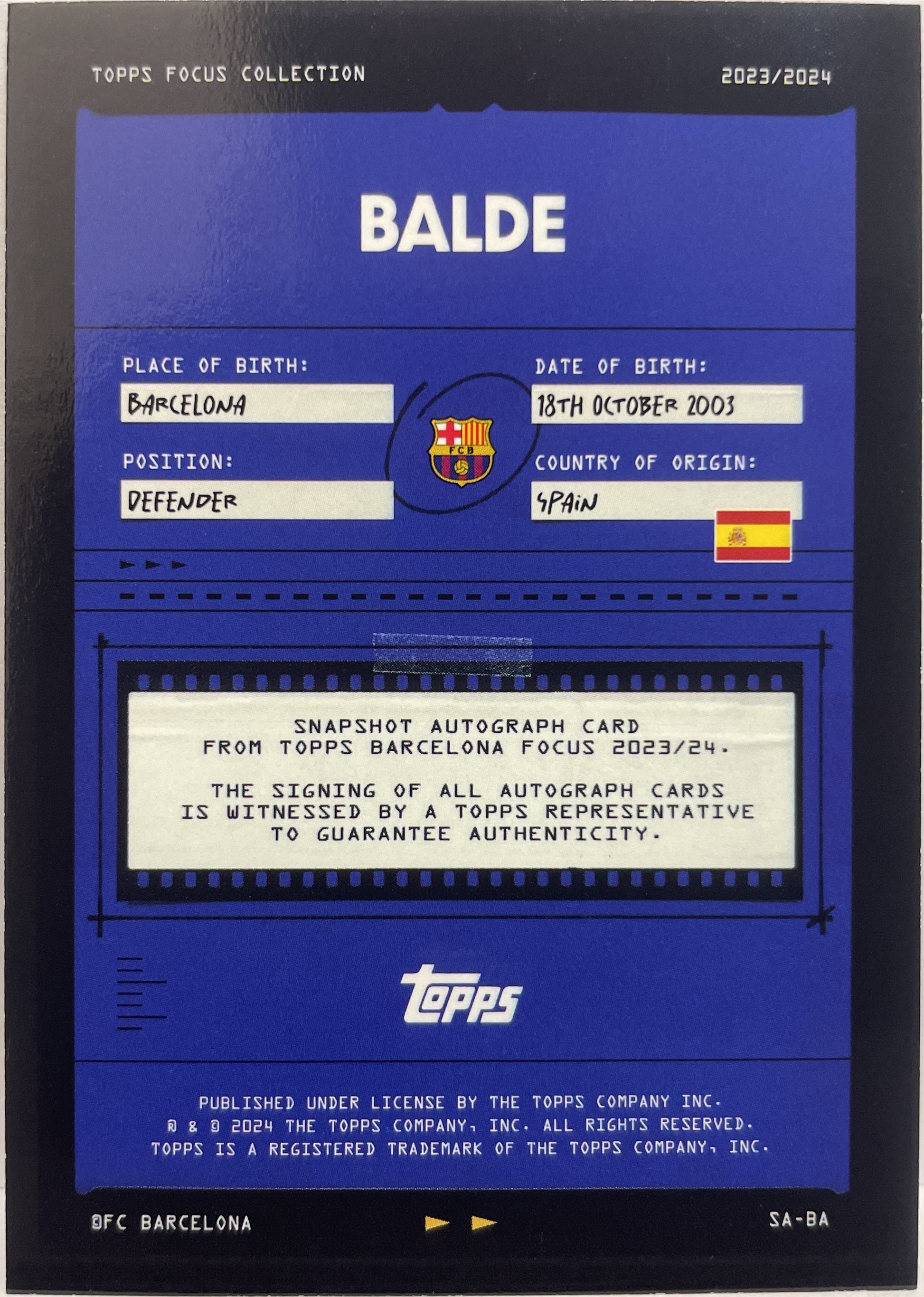 Alejandro Balde 23/25 Autograph Orange Topps Focus Barcelona 2023/24