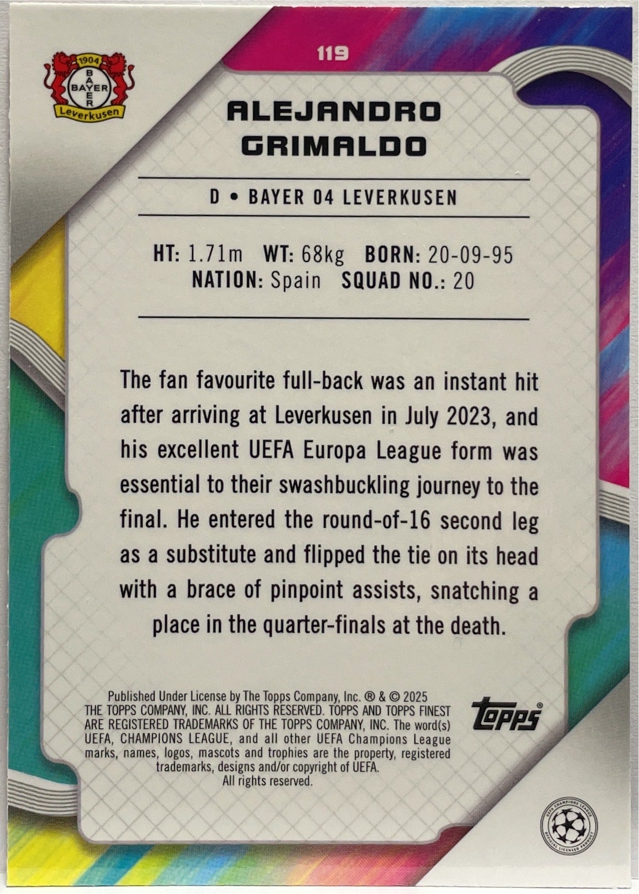 Alejandro Grimaldo 238/250 Pink RayWave Topps Finest UCC 2024/25 Bayer 04 Leverkusen