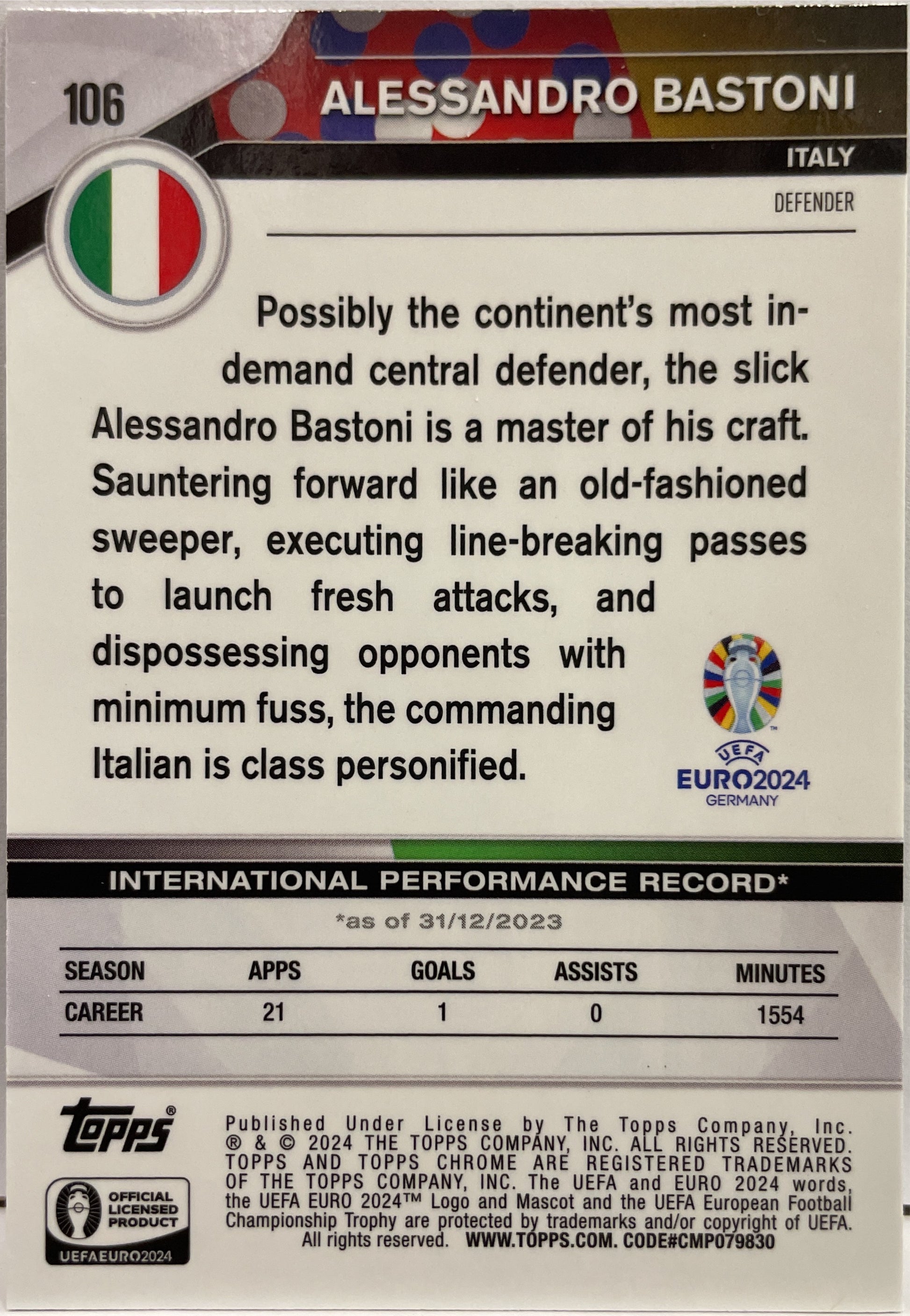 Alessandro Bastoni 24/50 Gold Topps Chrome Euro 2024 Italy