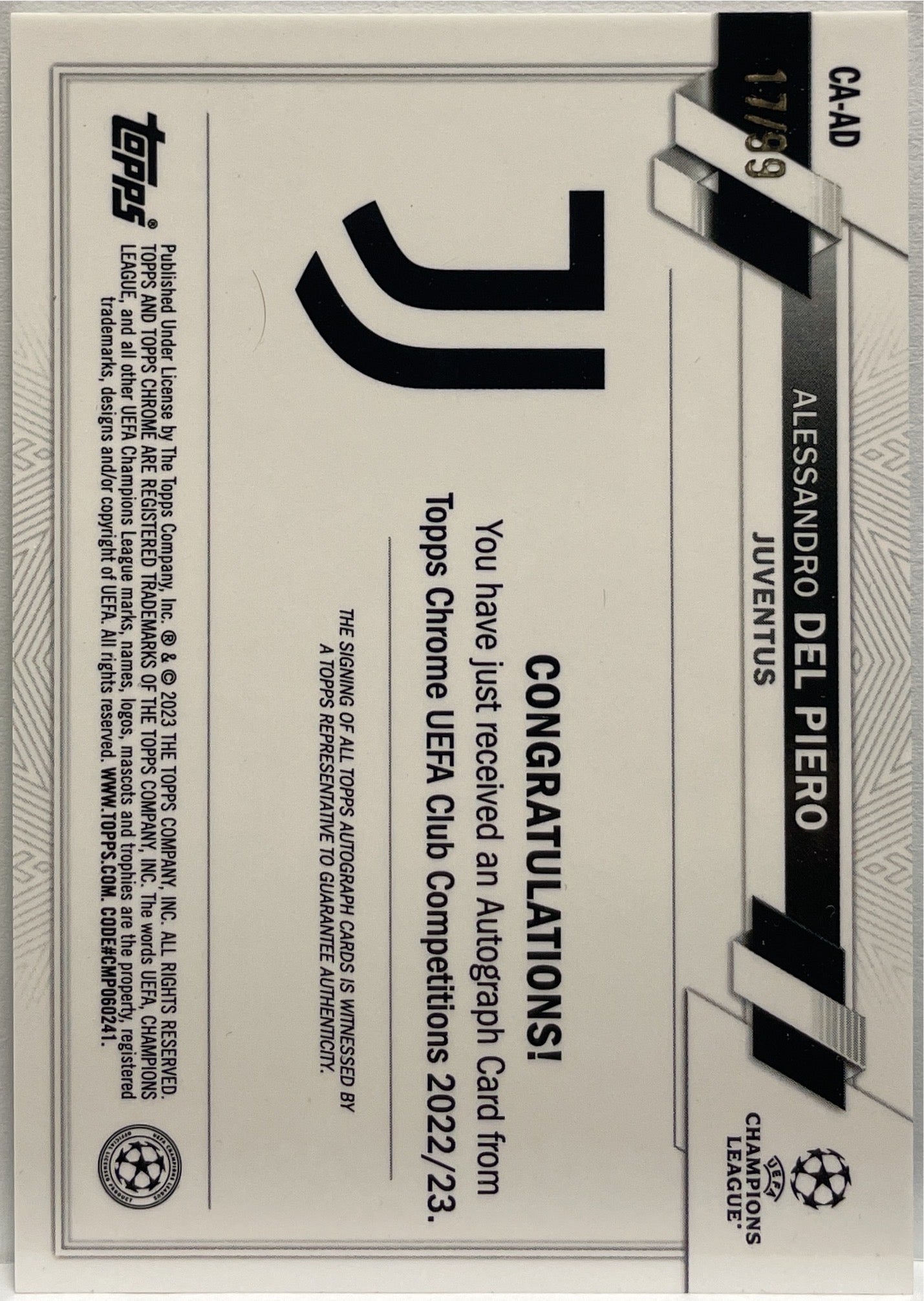 Alessandro Del Piero 17/99 Autograph Green Topps Chrome UCC 2022/23