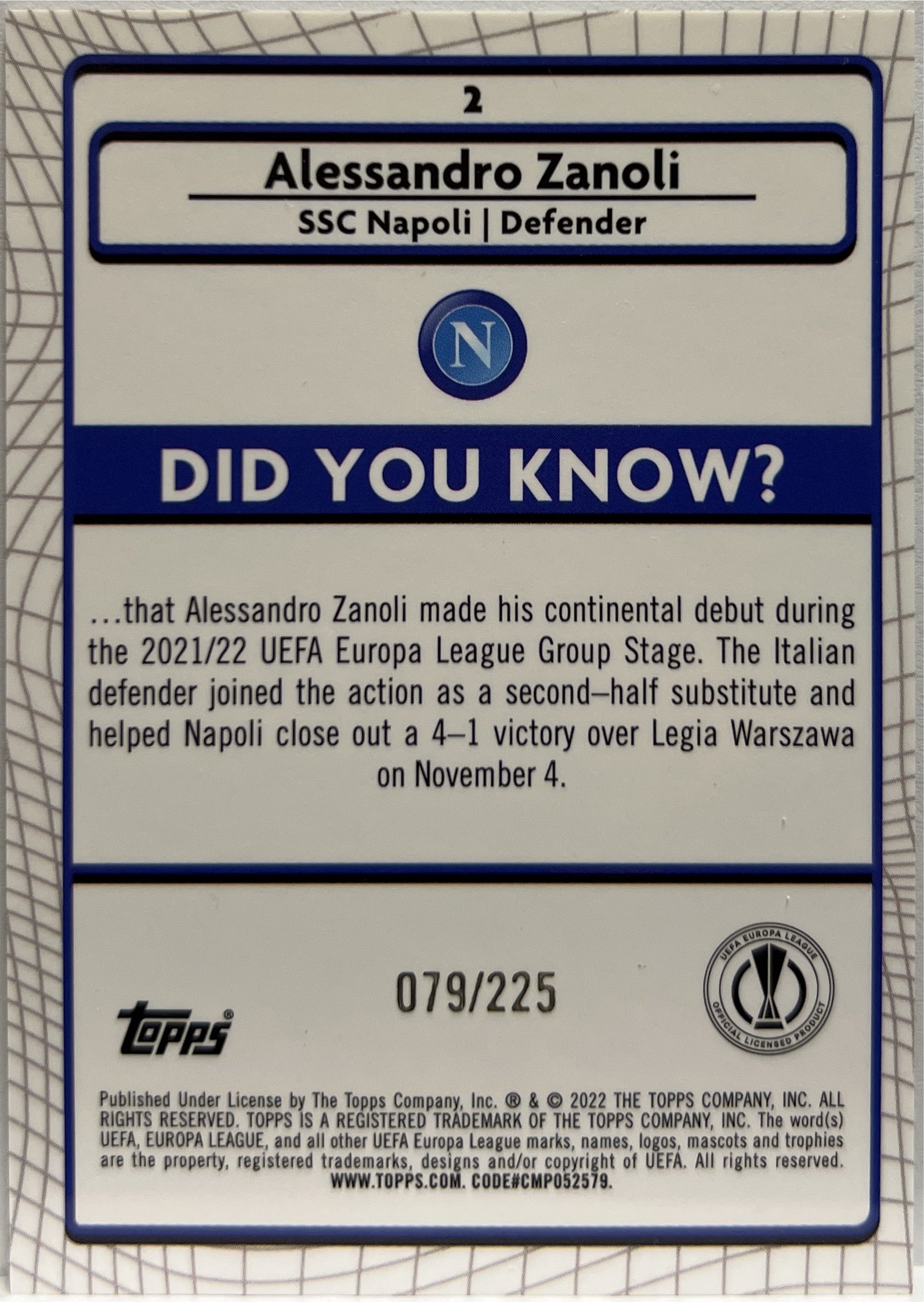 Alessandro Zanoli 79/225 Rookie Yellow Shimmer Topps Chrome Merlin 2021/22 SSC Napoli