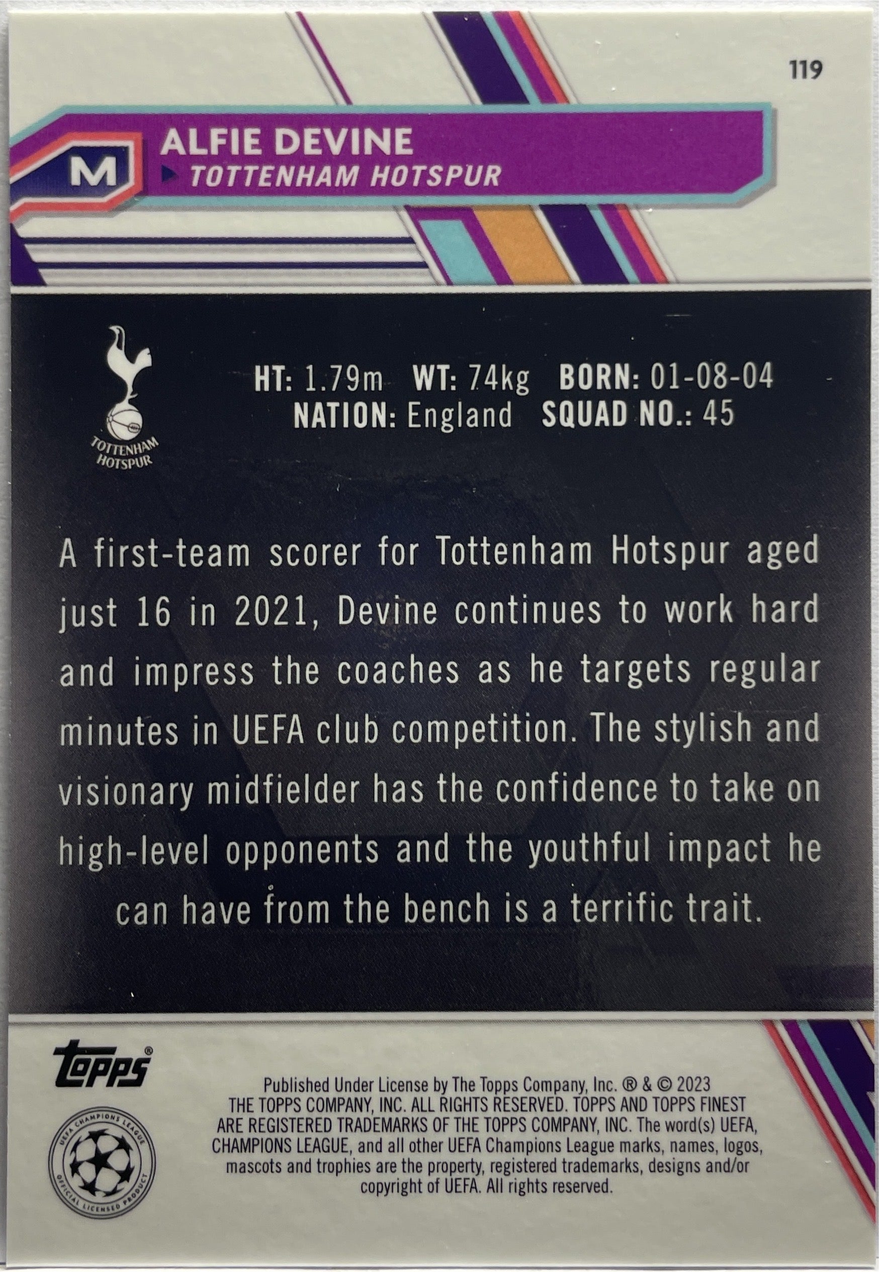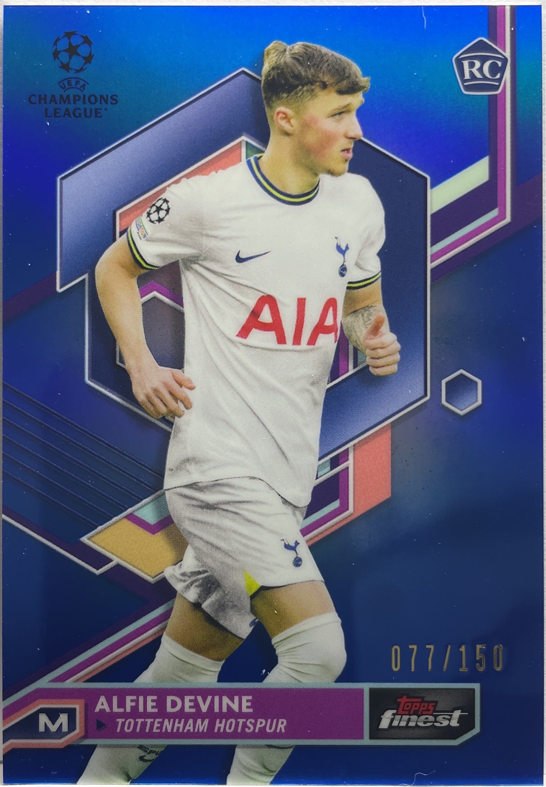 Alfie Devine 77/150 Rookie Blue Topps Finest UCC 2022/23 Tottenham Hotspur