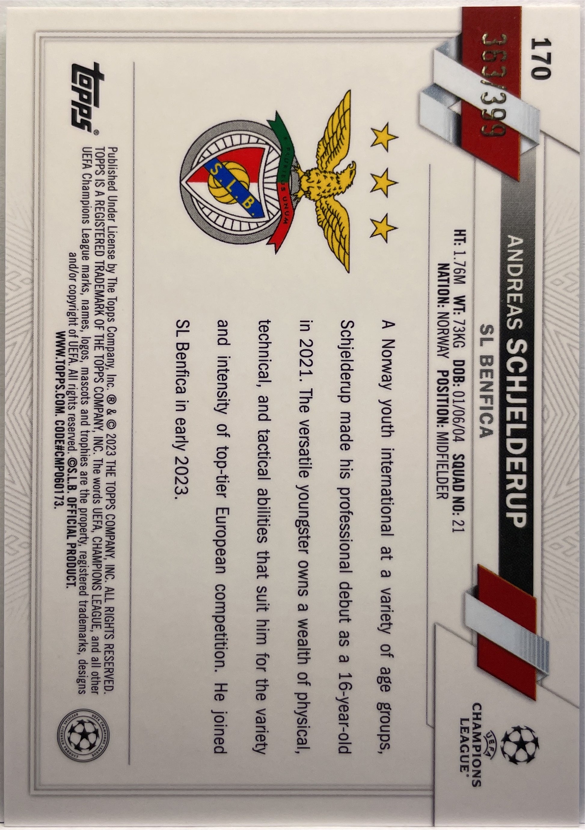 Andreas Schjelderup 363/399 Rookie Green Shimmer Topps Chrome UCC 2022/23 SL Benfica