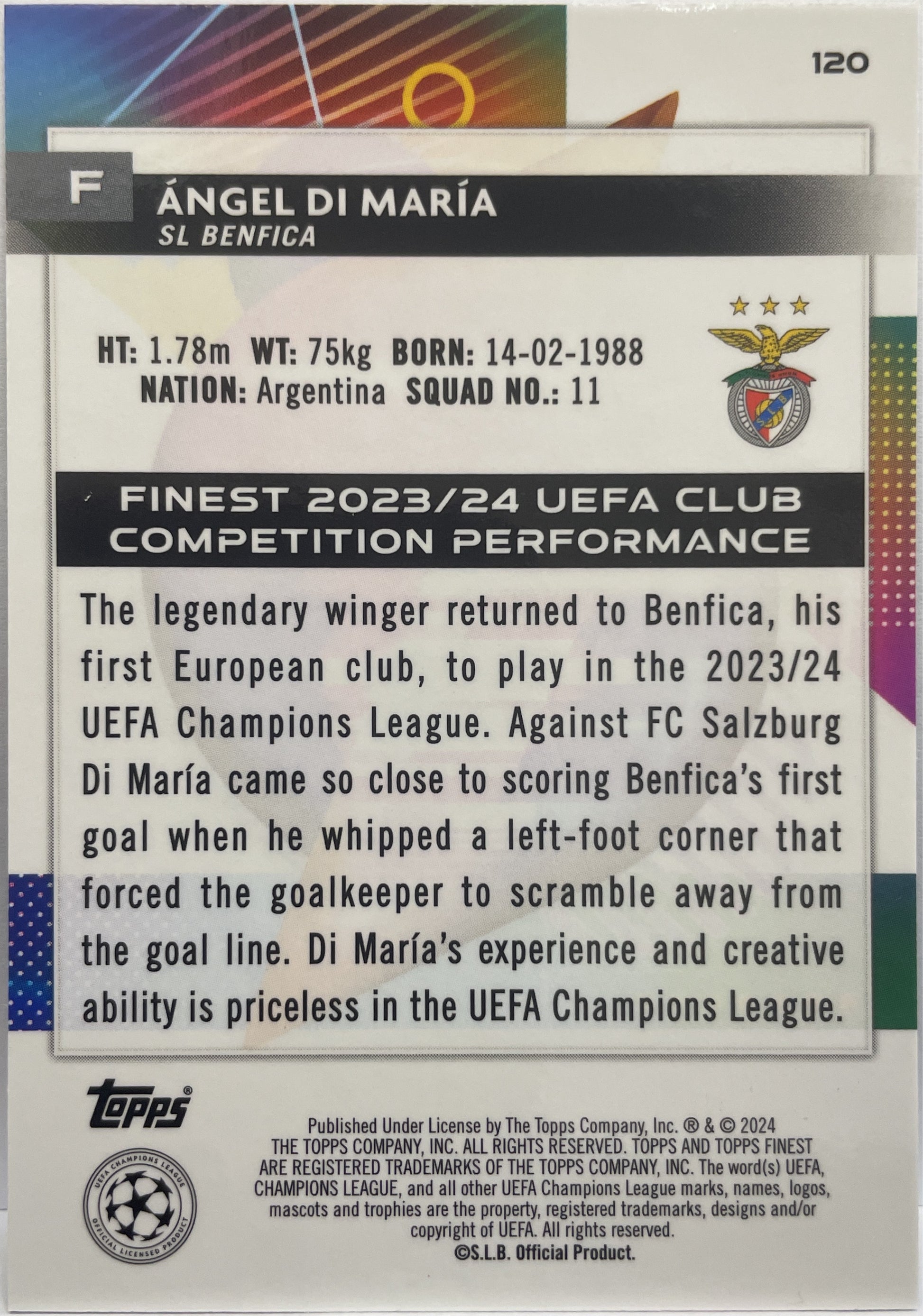 Angel Di Maria 158/250 Blue Aqua Vaporwave Topps Finest UCC 2023/24 SL Benfica