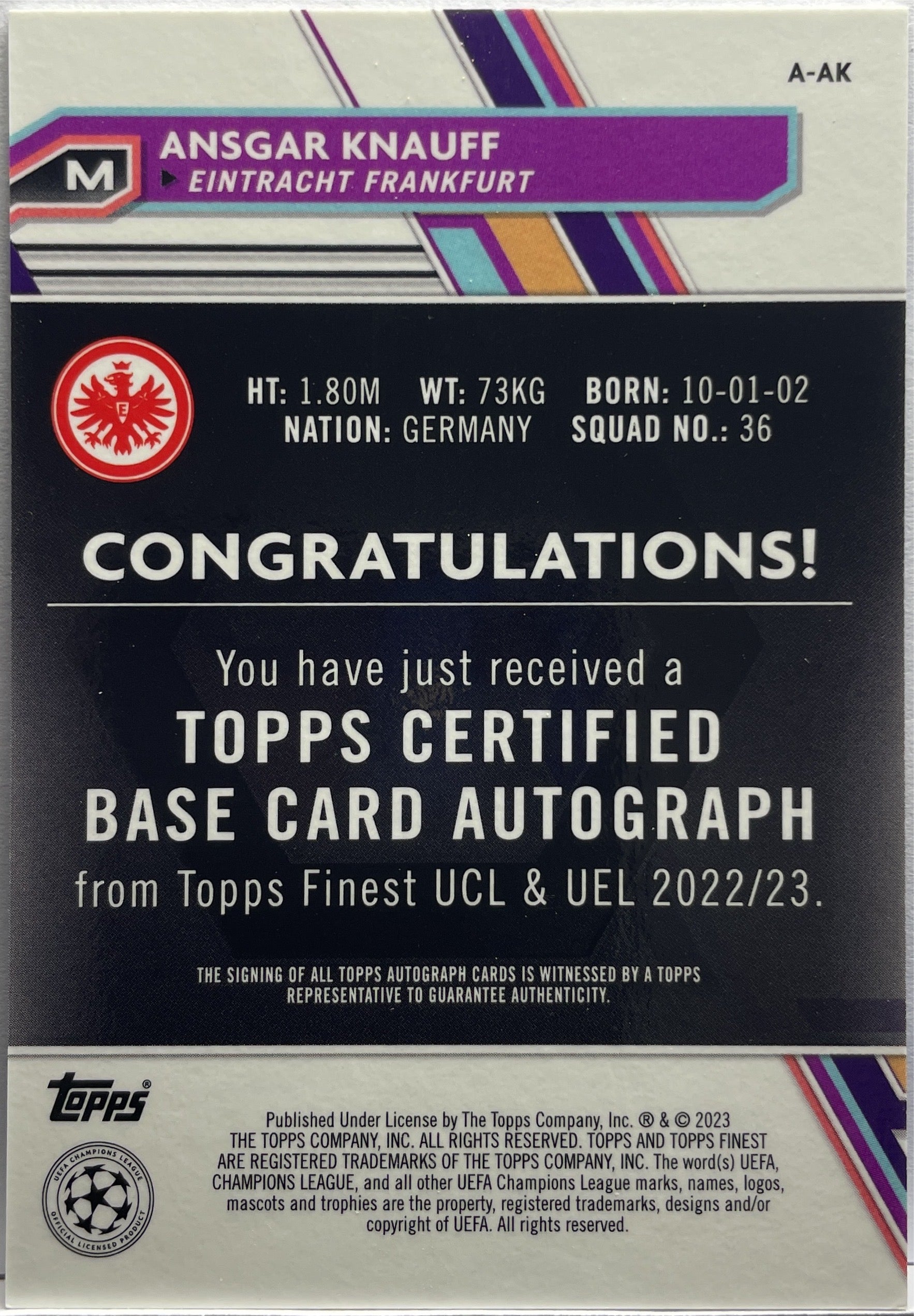 Ansgar Knauff 95/150 Autograph Blue Topps Finest UCC 2022/23 Eintracht Frankfurt