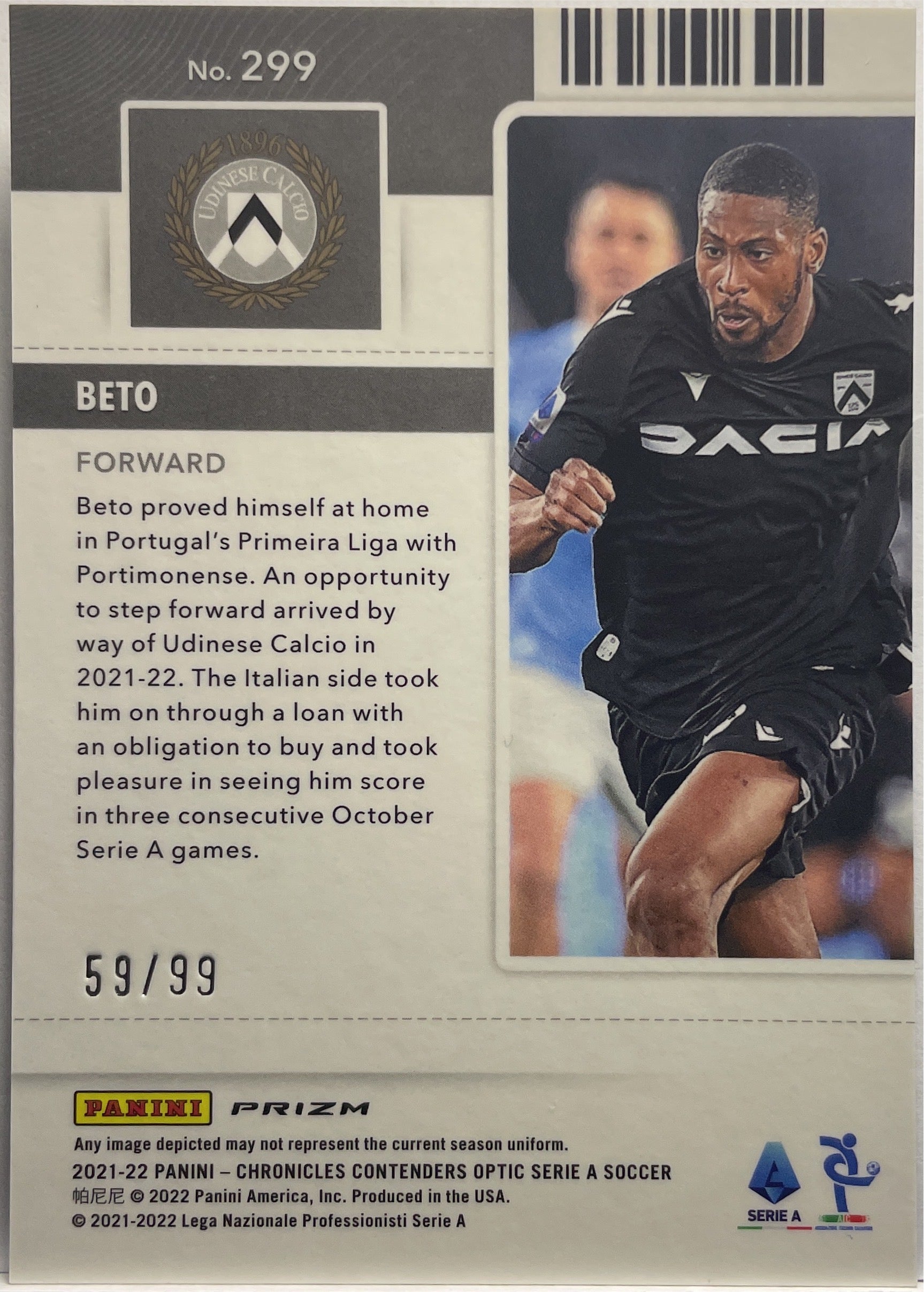 Beto 59/99 Rookie Ticket Panini Chronicles 2021/22 Udinese Calcio