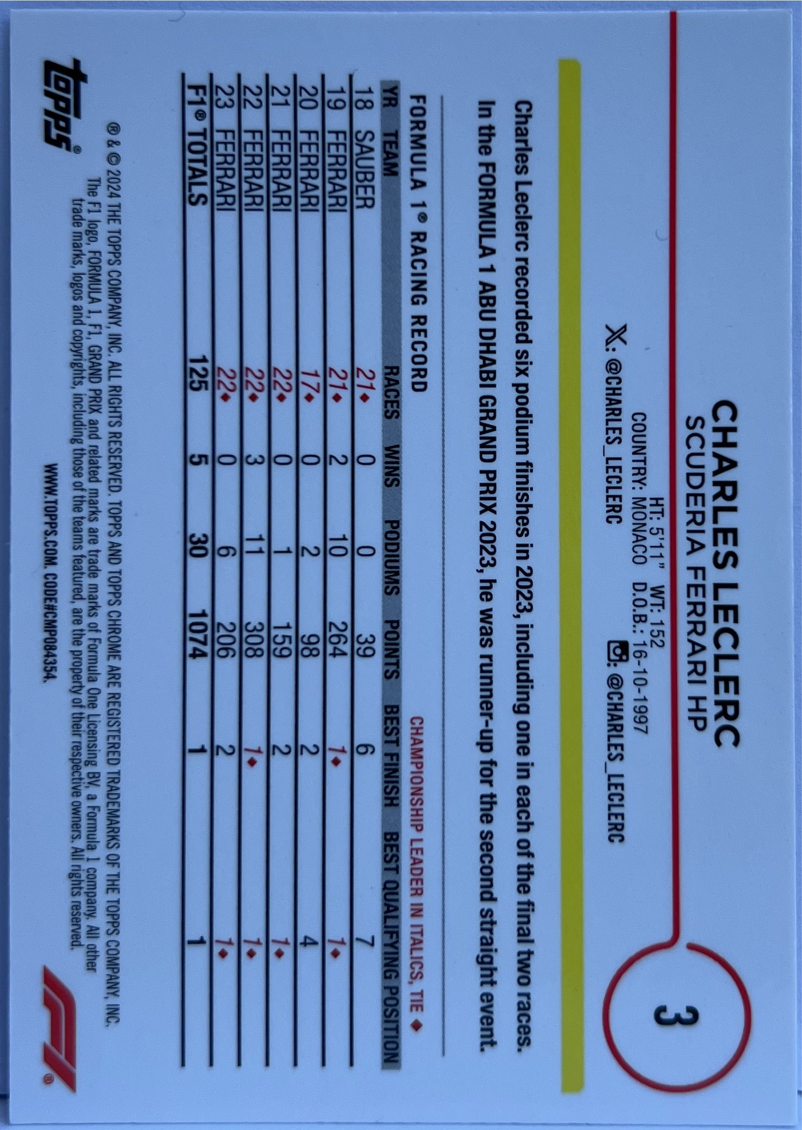 Charles Leclerc Topps Chrome F1 2024 Scuderia Ferrari HP