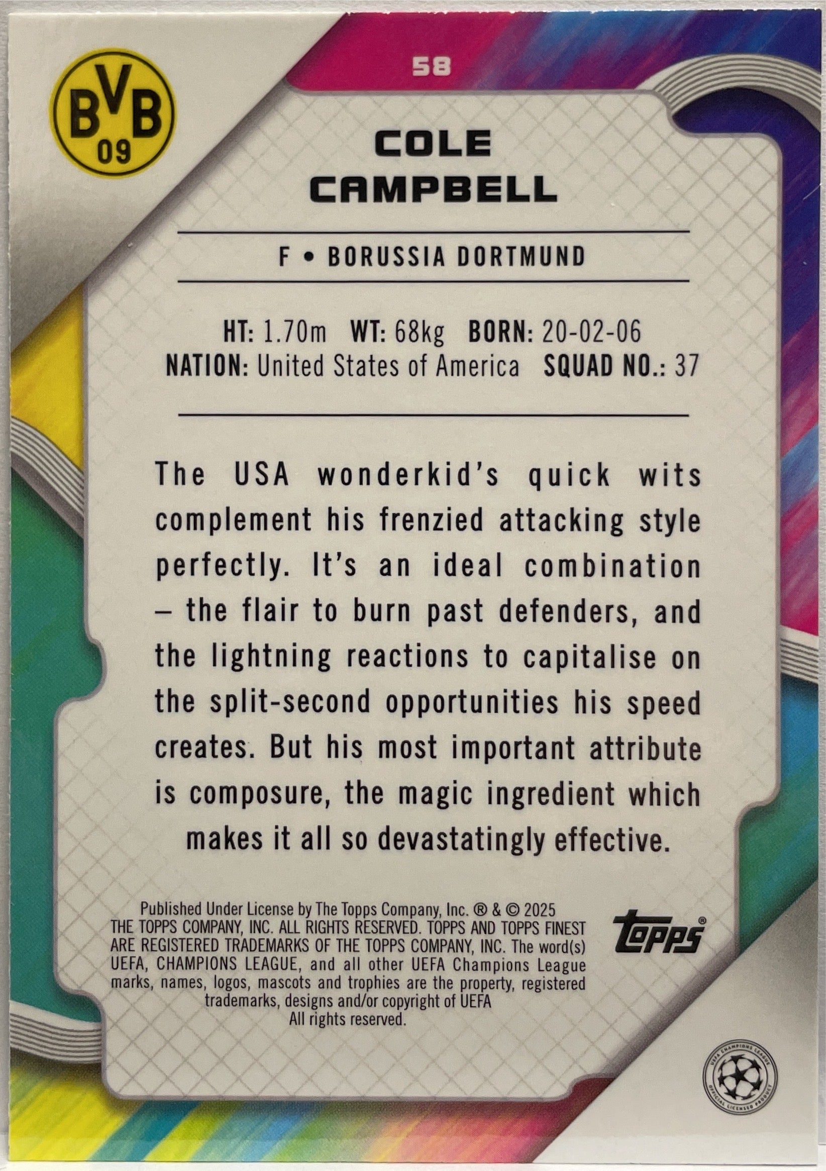 Cole Campbell 118/150 Rookie Blue Raywave Topps Finest UCC 2024/25 Borussia Dortmund