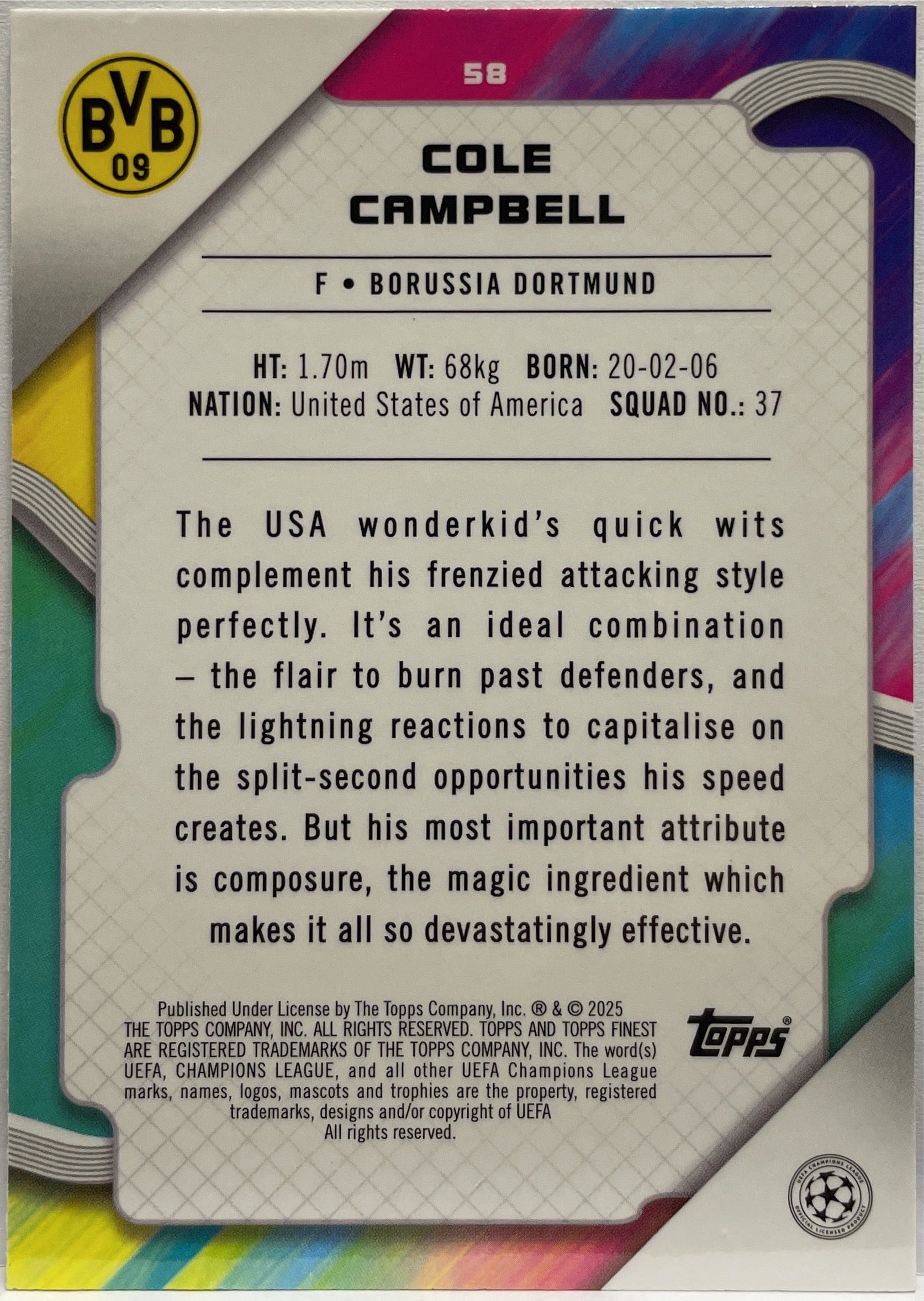 Cole Campbell 51/150 Rookie Blue Raywave Topps Finest UCC 2024/25 Borussia Dortmund