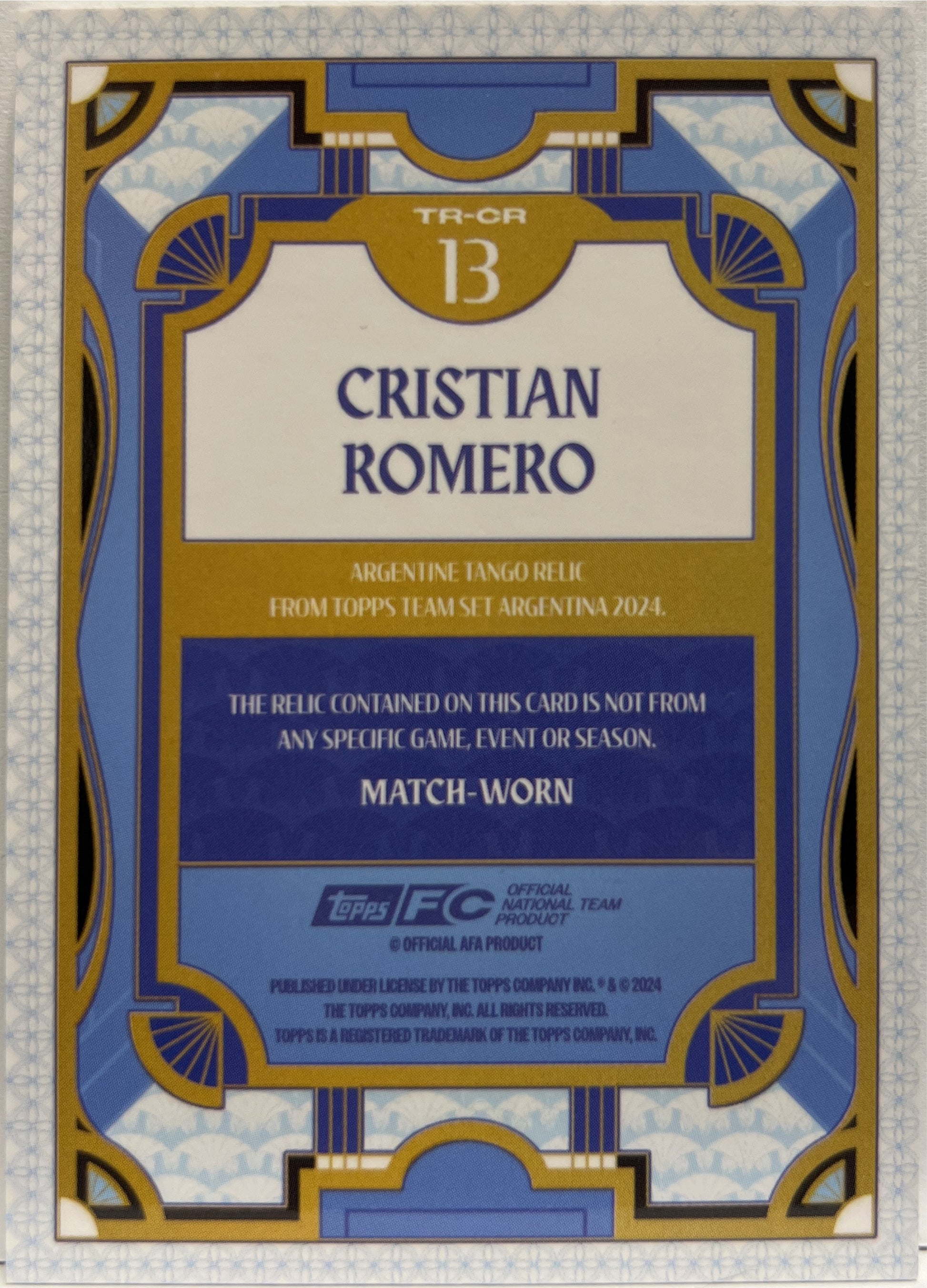 Cristian Romero Patch Tango Relic Topps Argentina Team Set 2024/25 blue2