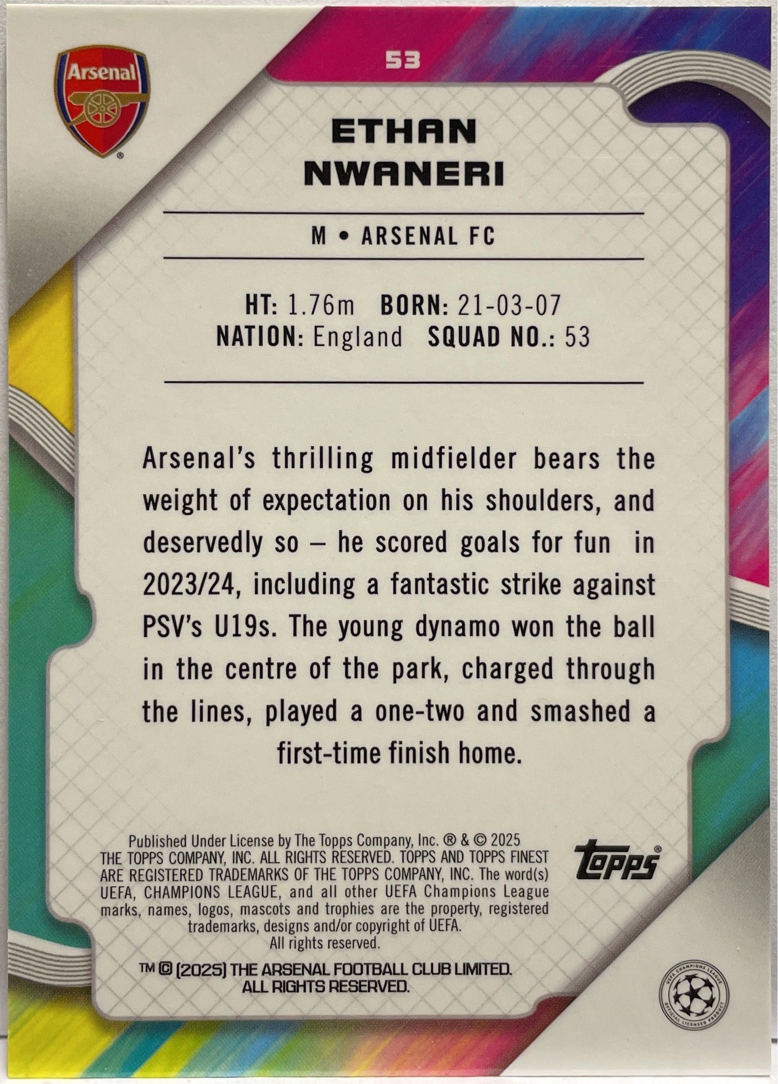 Ethan Nwaneri 40/199 Rookie Purple Lava Topps Finest UCC 2024/25 Arsenal FC