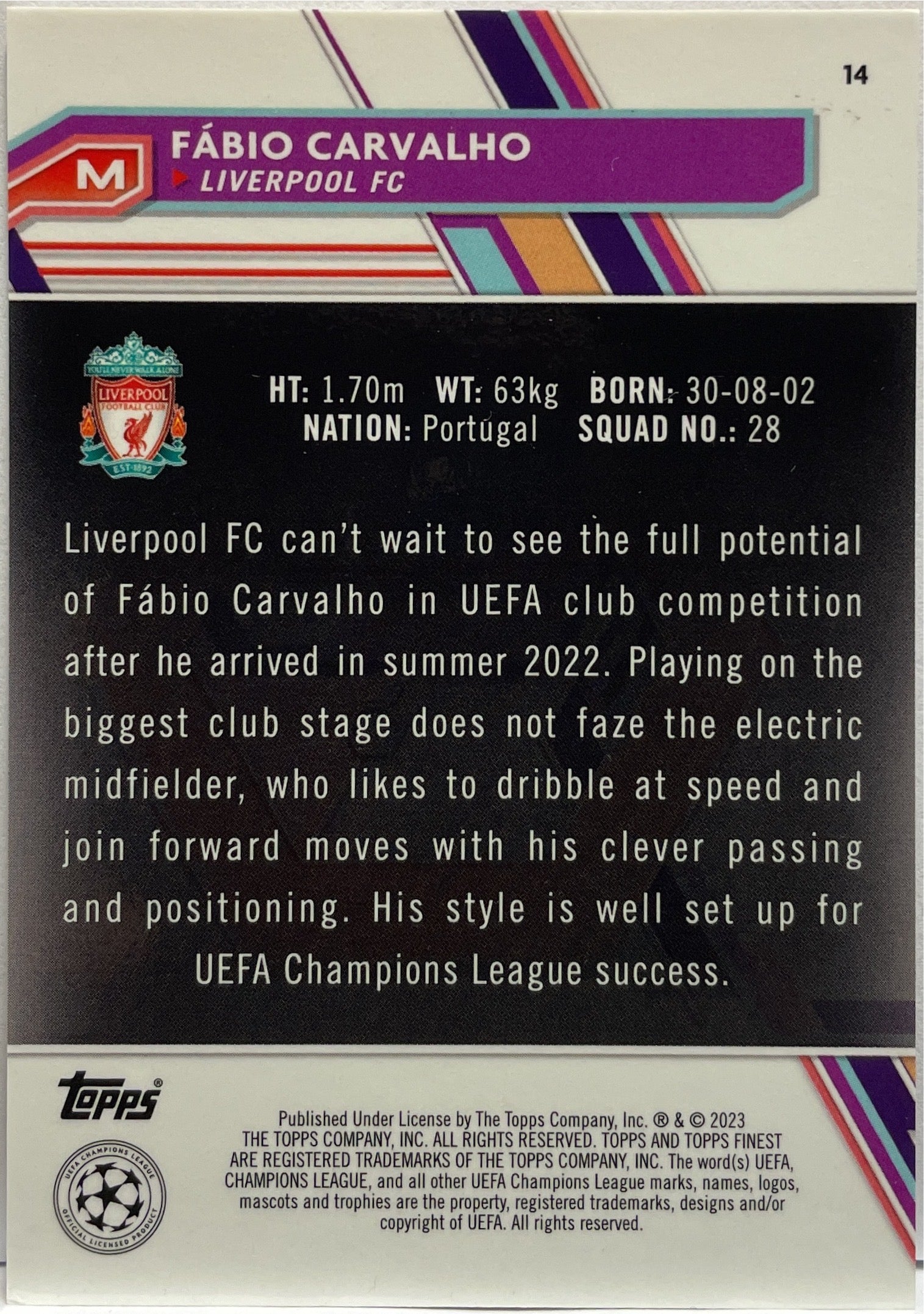 Fabio Carvalho 21/25 Rookie Orange Topps Finest UCC 2022/23 Liverpool FC
