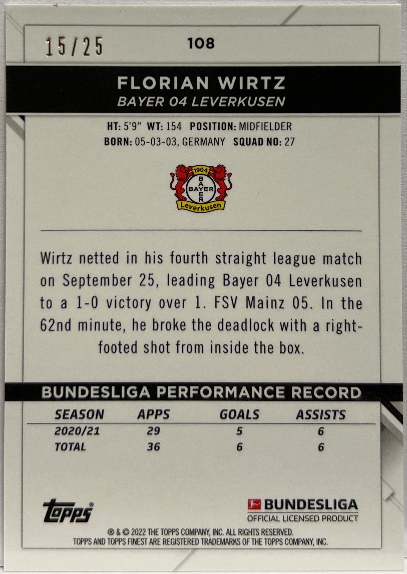 Florian Wirtz 15/25 Orange Topps Finest Bundesliga 2021/22 Bayer 04 Leverkusen