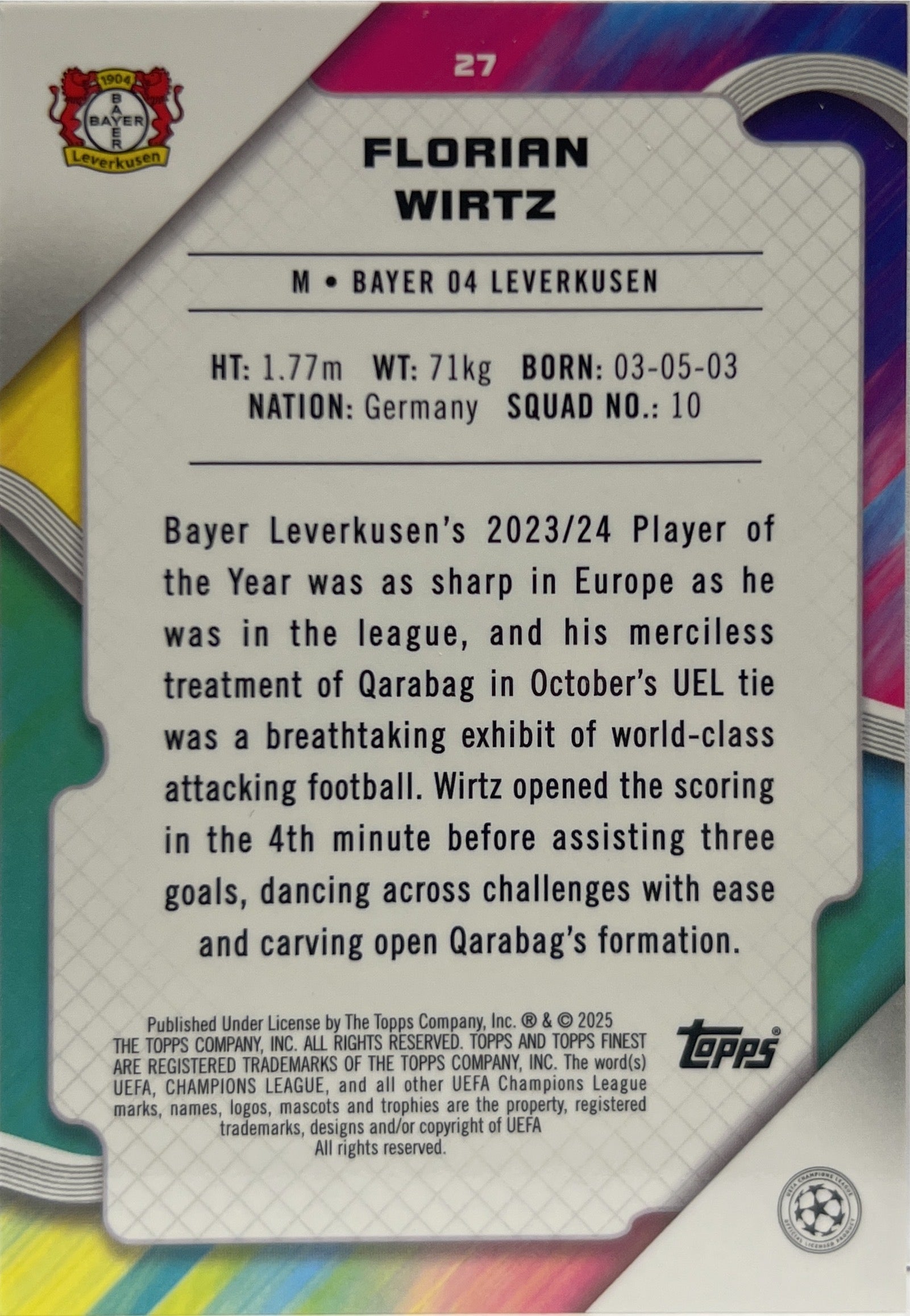 Florian Wirtz 20/25 Orange Topps Finest UCC 2024/25 Bayer 04 Leverkusen