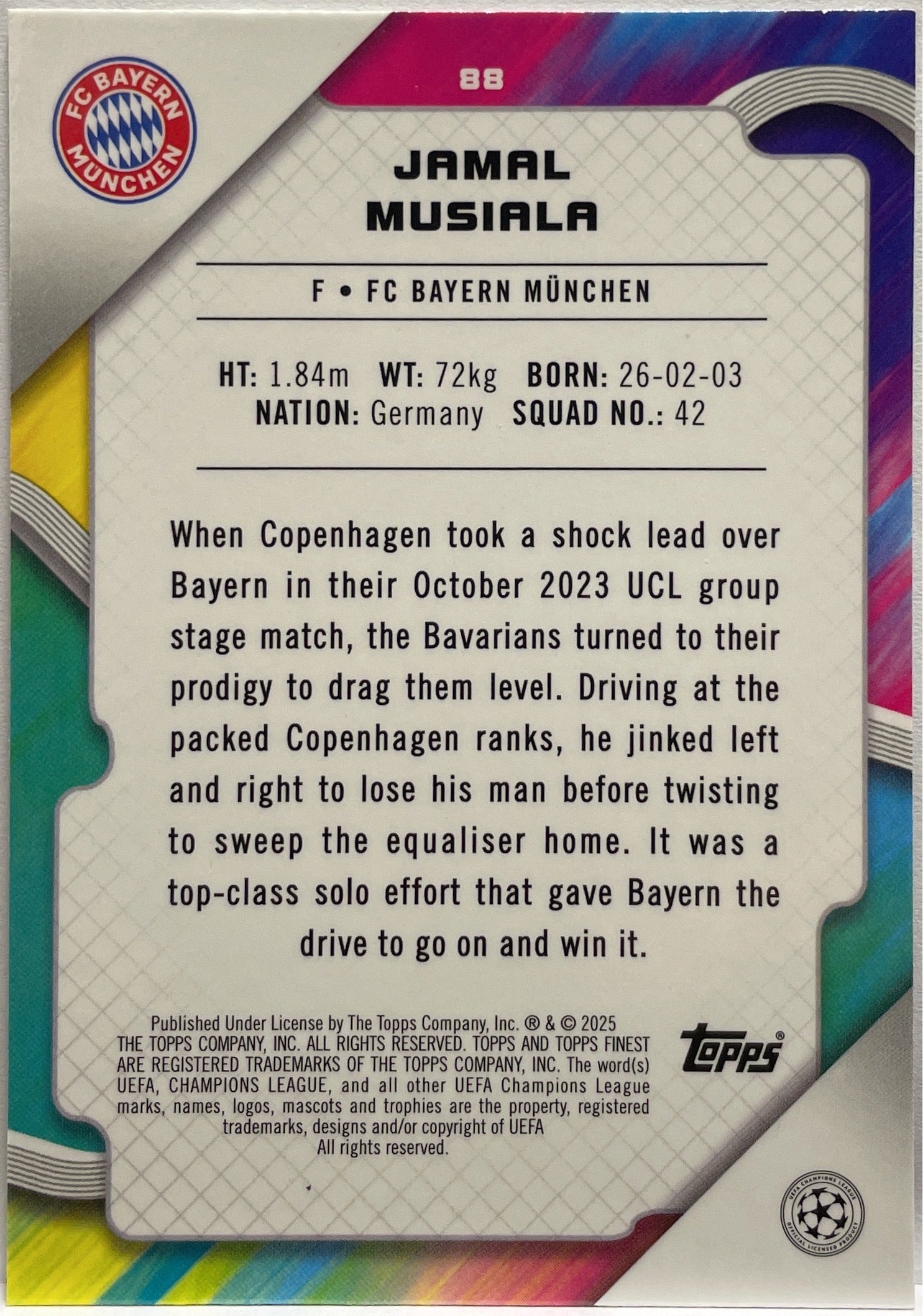 Jamal Musiala 50/125 Pink Prism Topps Finest UCC 2024/25 FC Bayern Munchen