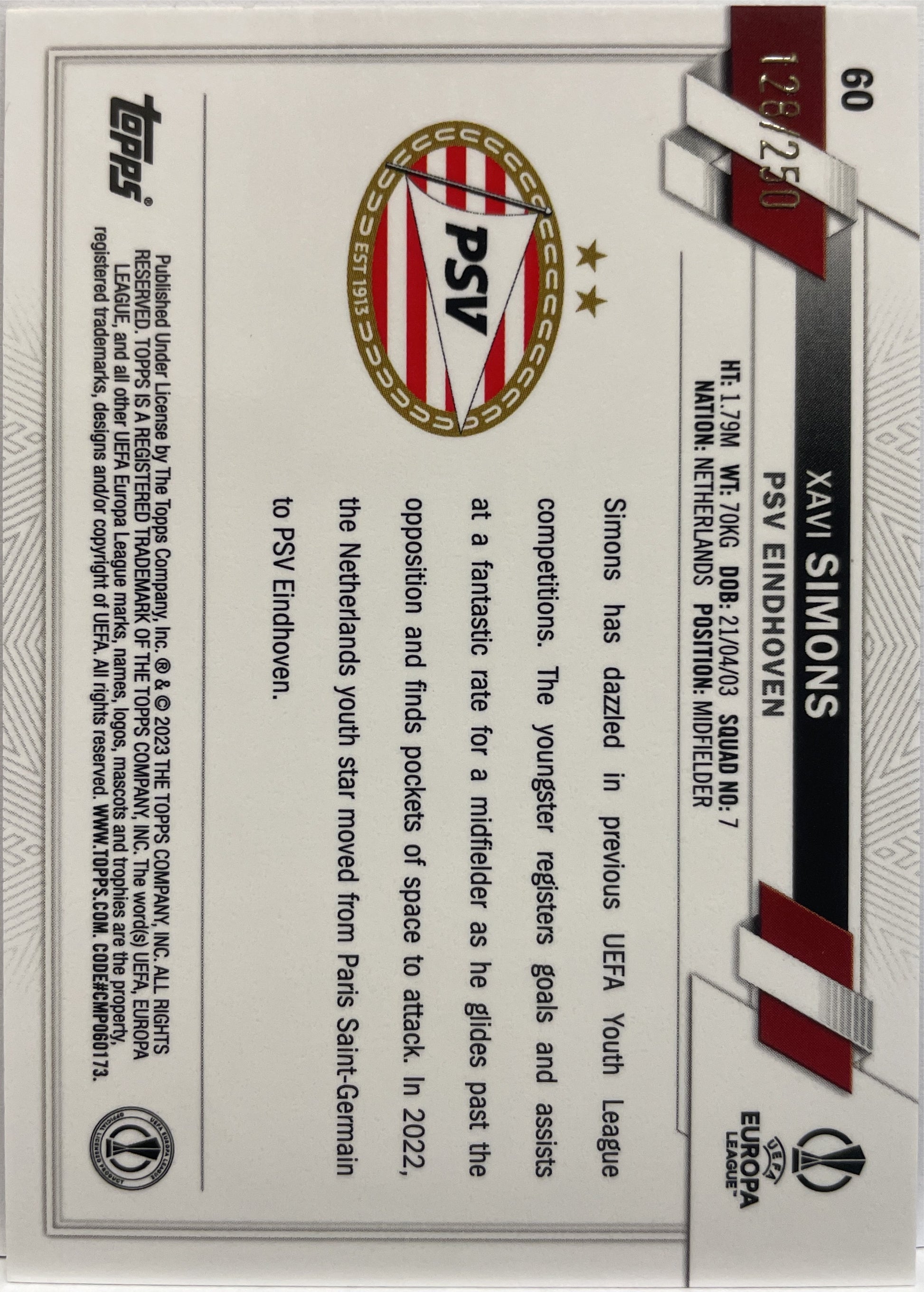 Xavi Simons 128/250 Pink Topps Chrome UCC 2022/23 PSV Eindhoven