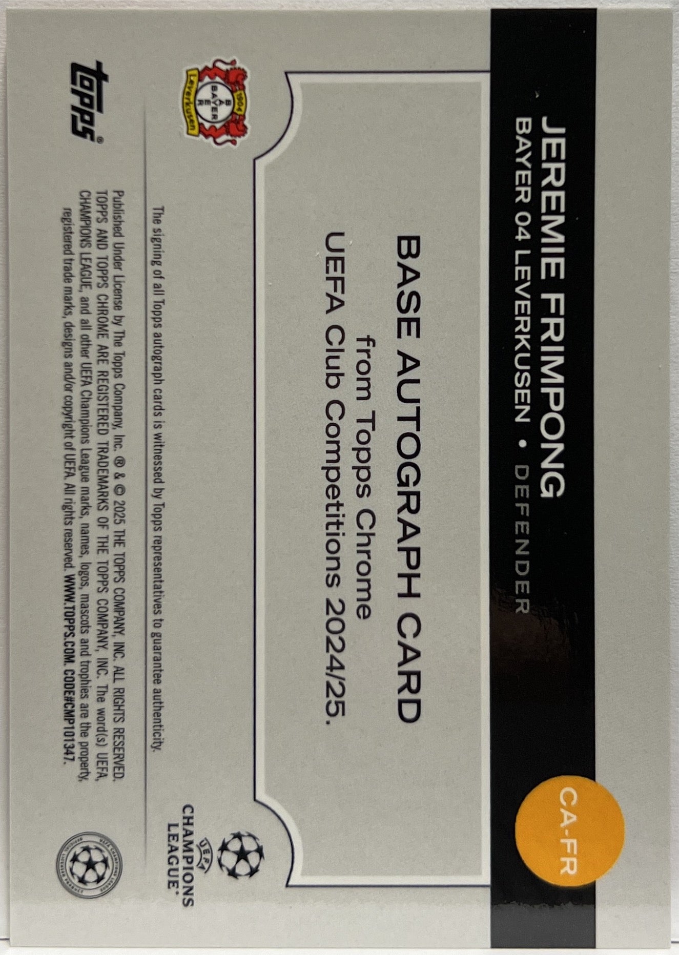 Jeremie Frimpong 7/25 Autograph Orange Lava Topps Chrome UCC 2024/25 Bayer 04 Leverkusen