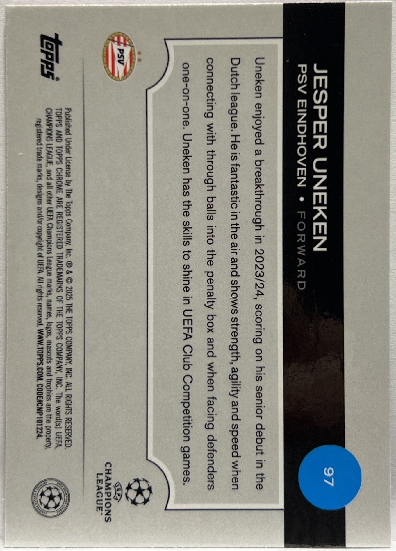 Jesper Uneken 39/250 Rookie Pink Lava Topps Chrome UCC 2024/25 PSV Eindhoven