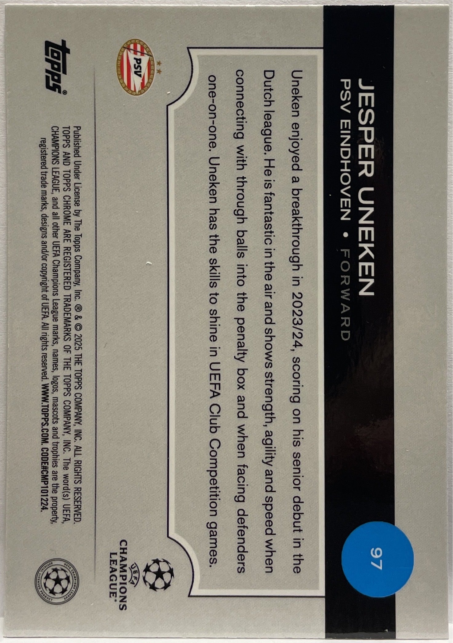 Jesper Uneken 72/299 Rookie Pink Topps Chrome UCC 2024/25 PSV Eindhoven
