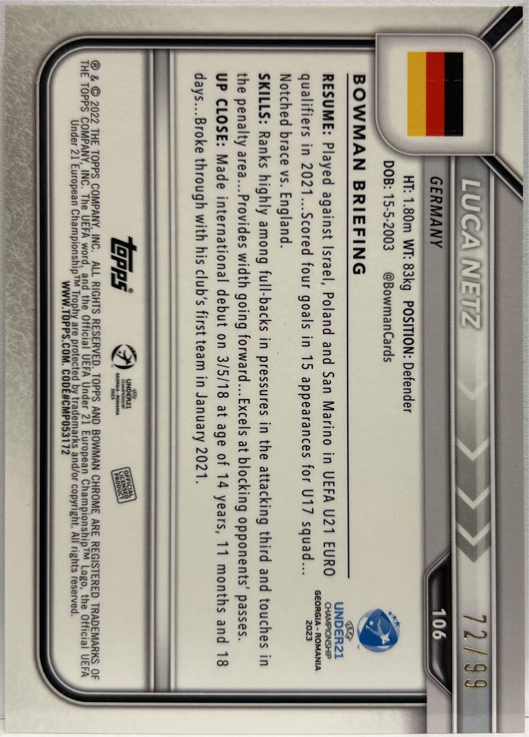 Luca Netz 72/99 Green Topps Chrome Bowman Uefa U21 2023 Germany