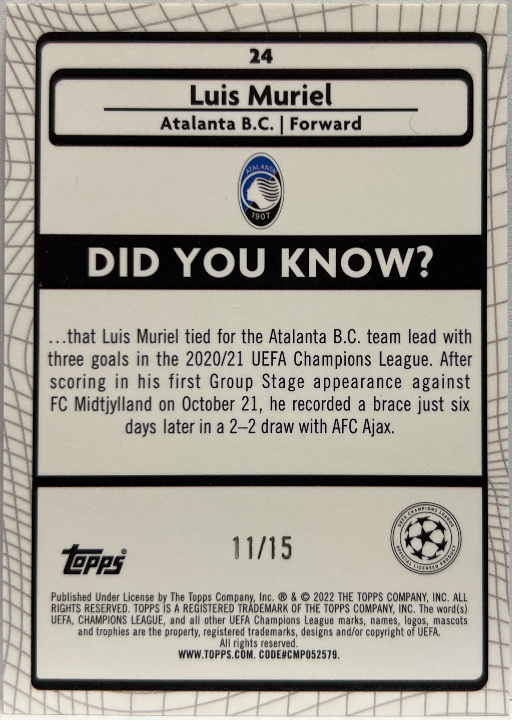 Luis Muriel 11/15 Purple Topps Chrome Merlin 2021/22 Atalanta BC