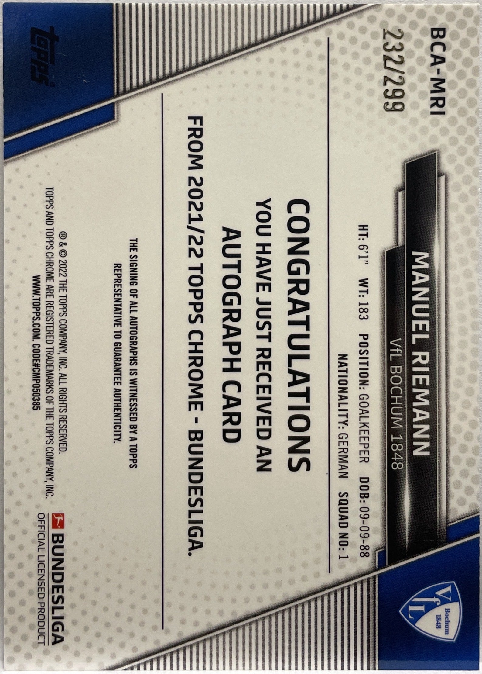 Manuel Riemann 232/299 Autograph Blue Topps Chrome Bundesliga 2021/22 VLF Bochum 1848
