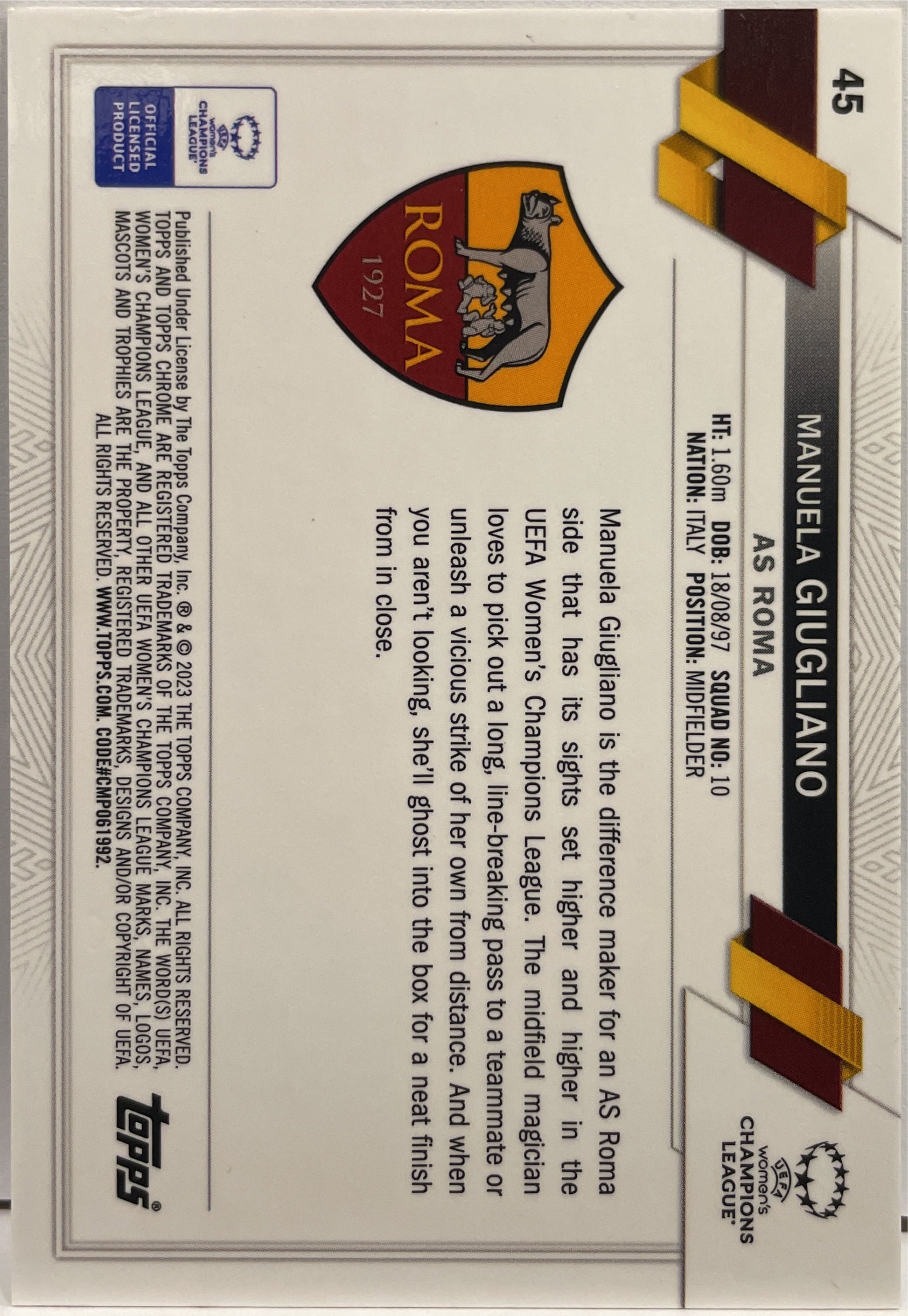 Manuela Giugliano 7/10 Rookie Black Topps Chrome UCC 2022/23 AS Roma