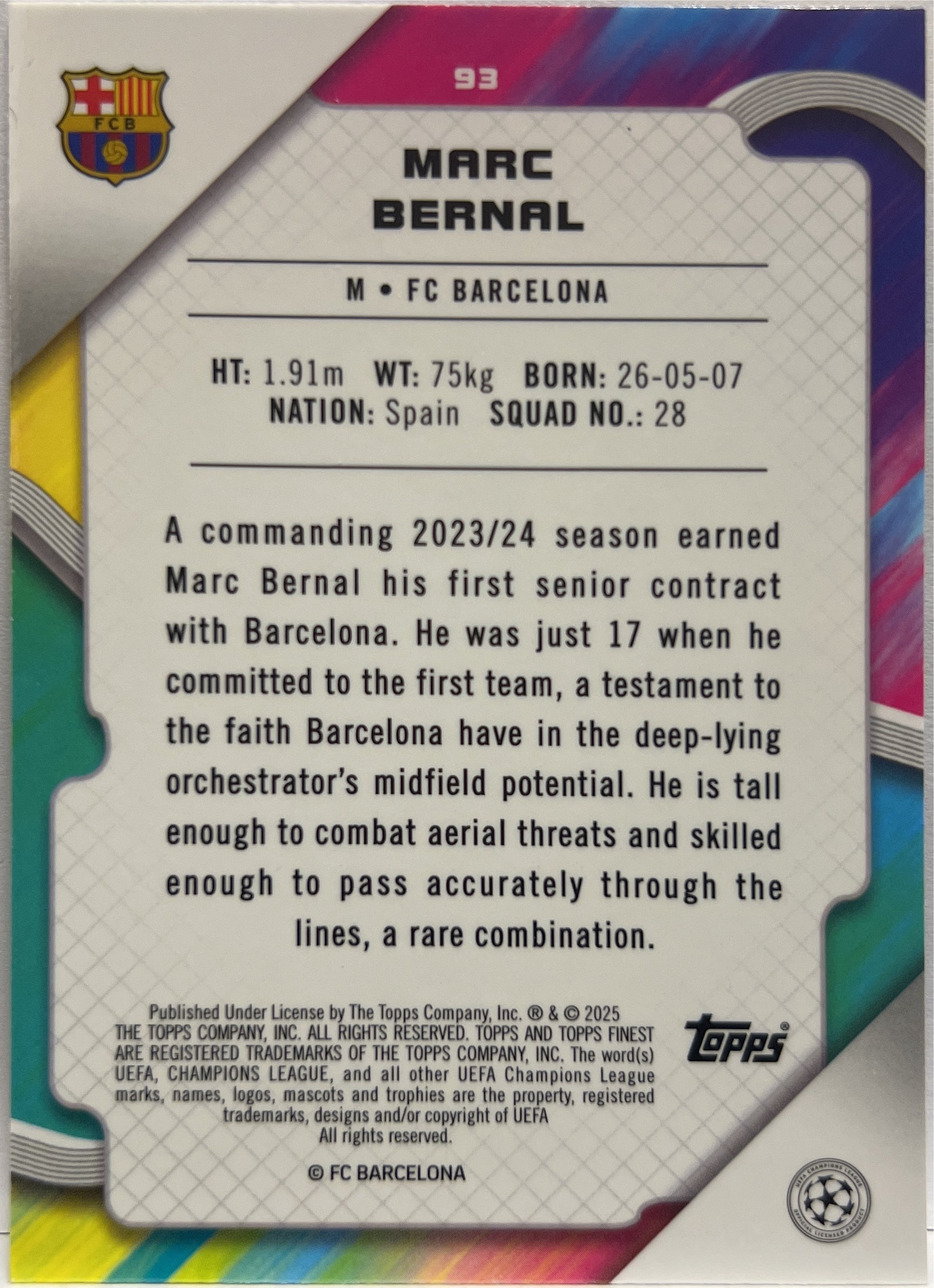 Marc Bernal 219/275 Rookie Sky Blue Topps Finest UCC 2024/25 FC Barcelona