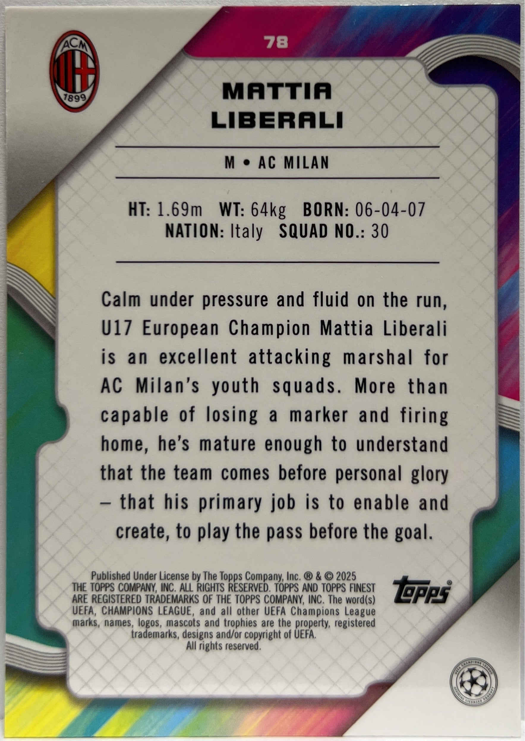 Mattia Liberali 216/299 Rookie Purple Topps Finest UCC 2024/25 AC Milan