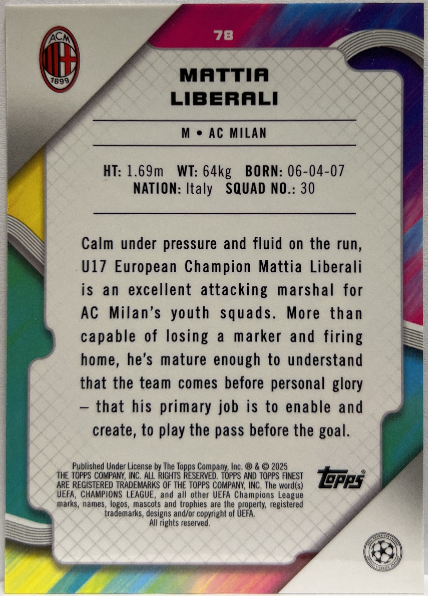 Mattia Liberali 90/275 Rookie Sky Blue Topps Finest UCC 2024/25 AC Milan