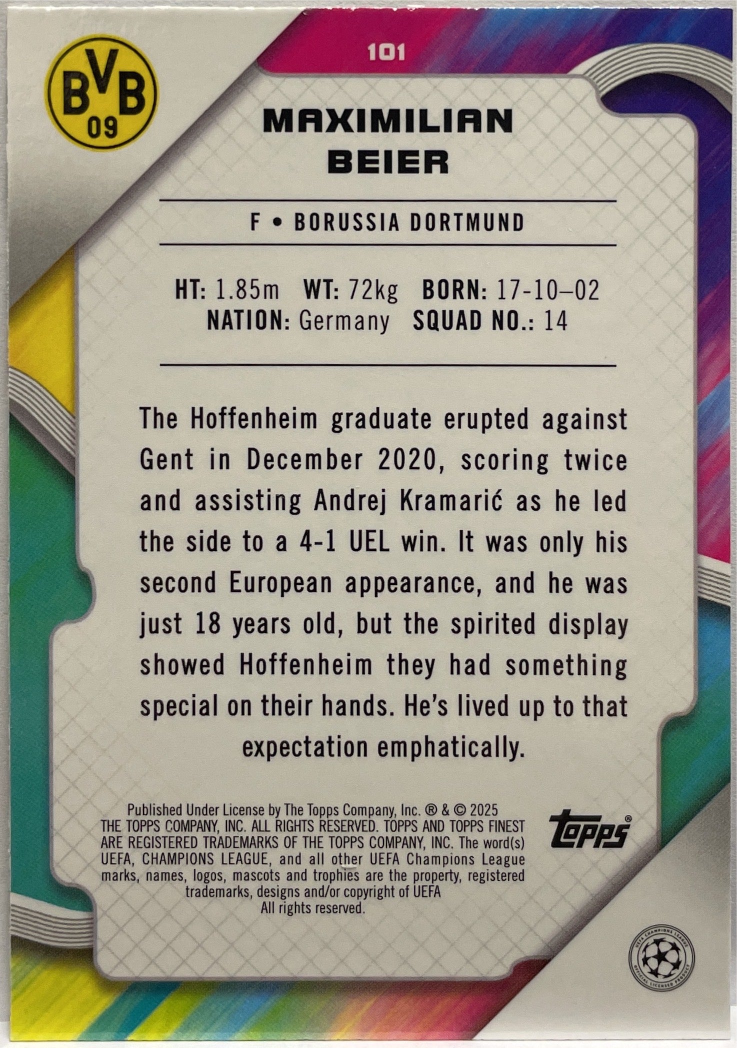 Maximilian Beier 54/299 Purple Topps Finest UCC 2024/25 Borussia Dortmund