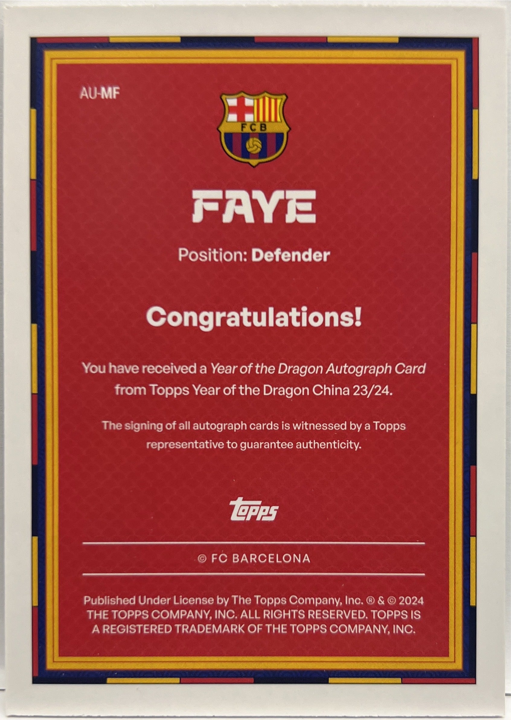 Mikayil Faye Rookie Autograph Topps Barcelona Year Of The Dragon 2023/24