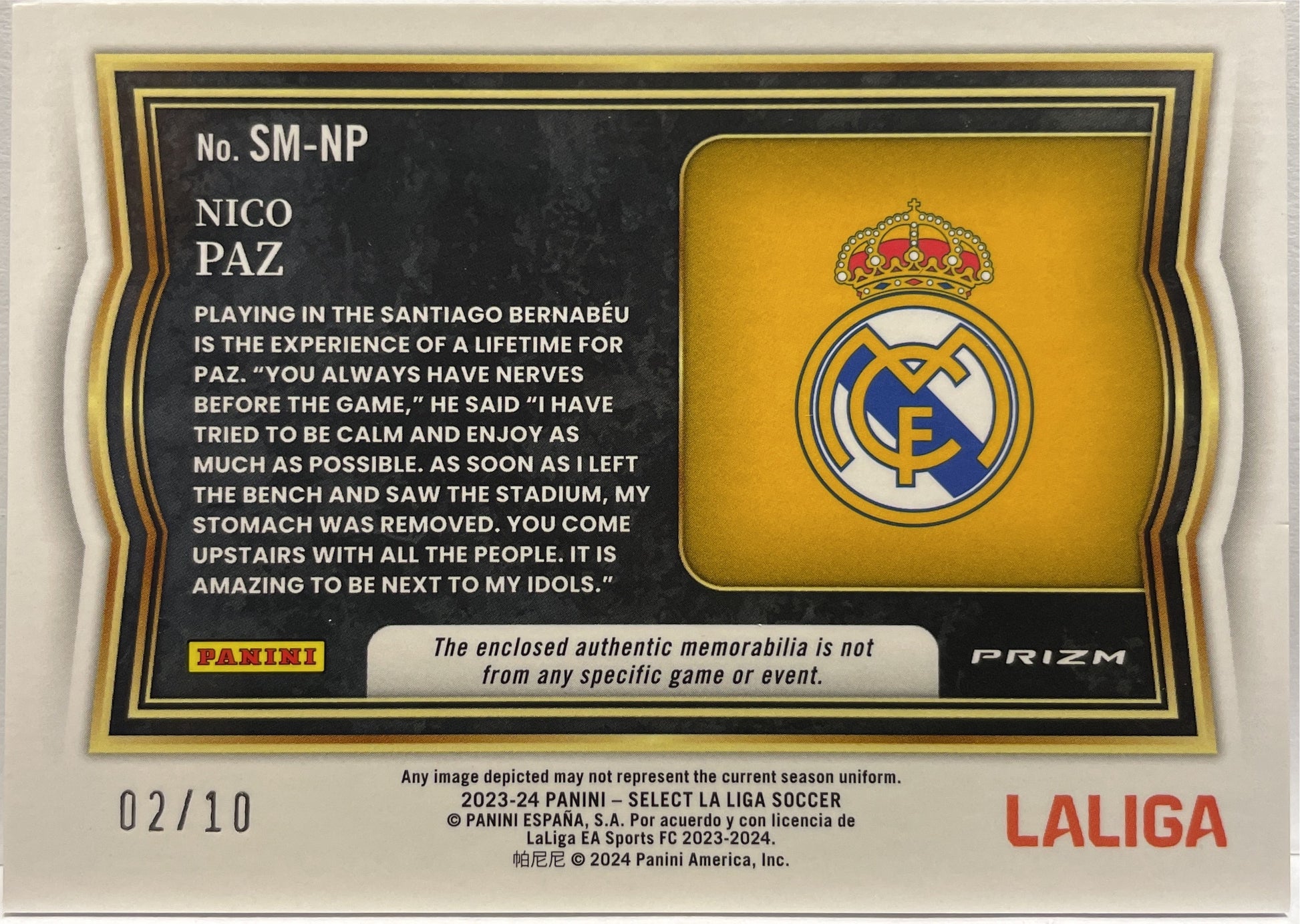 Nico Paz 2/10 Rookie Patch Gold Select La Liga 2023/24 Real Madrid