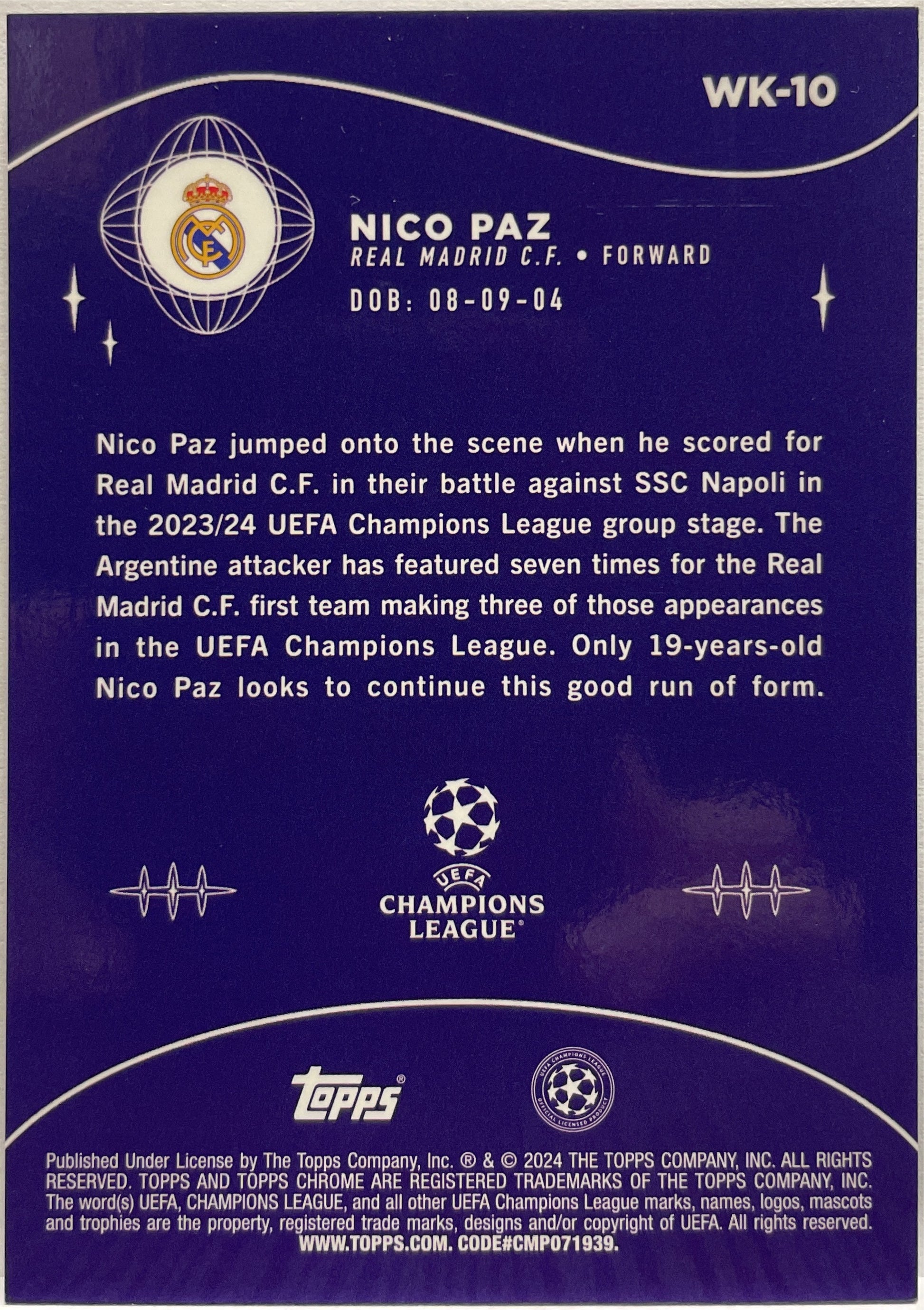 Nico Paz 5/99 Rookie Wonderkids Cracked Ice Topps Chrome UCC 2023/24 Real Madrid
