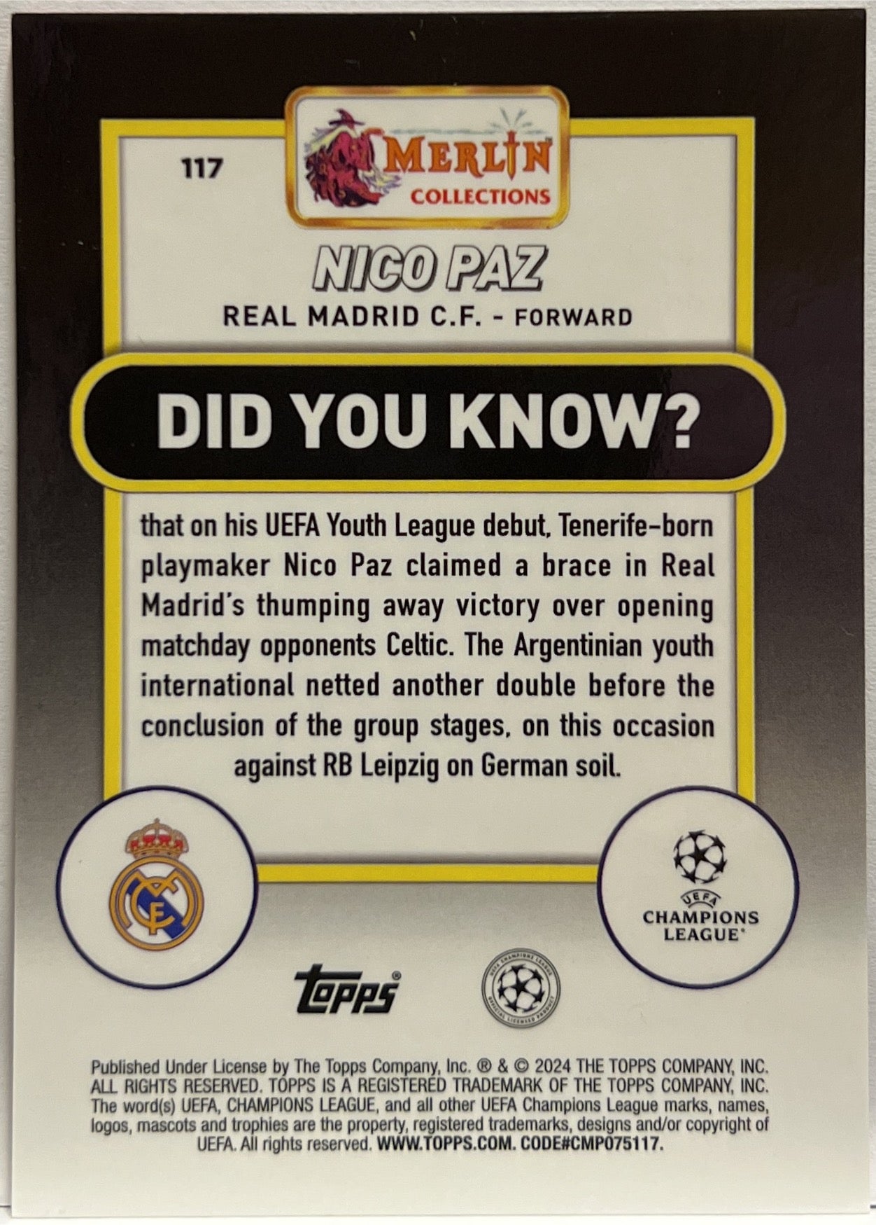 Nico Paz 8/25 Rookie Orange Mojo Topps Chrome Merlin UCC 2023/24 Real Madrid