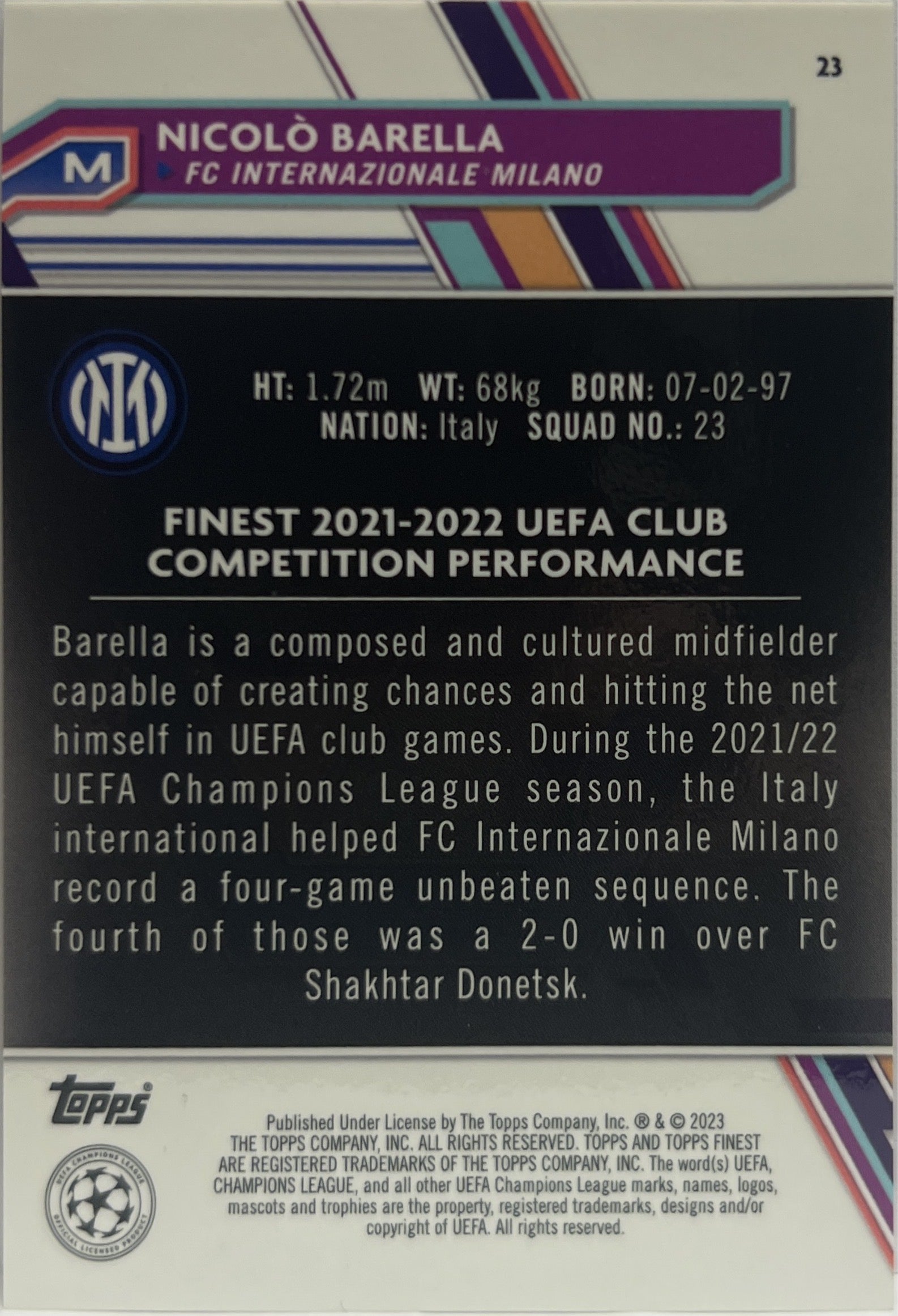 Nicolo Barella 11/25 Orange Topps Finest UCC 2022/23 FC Internazionale Milano