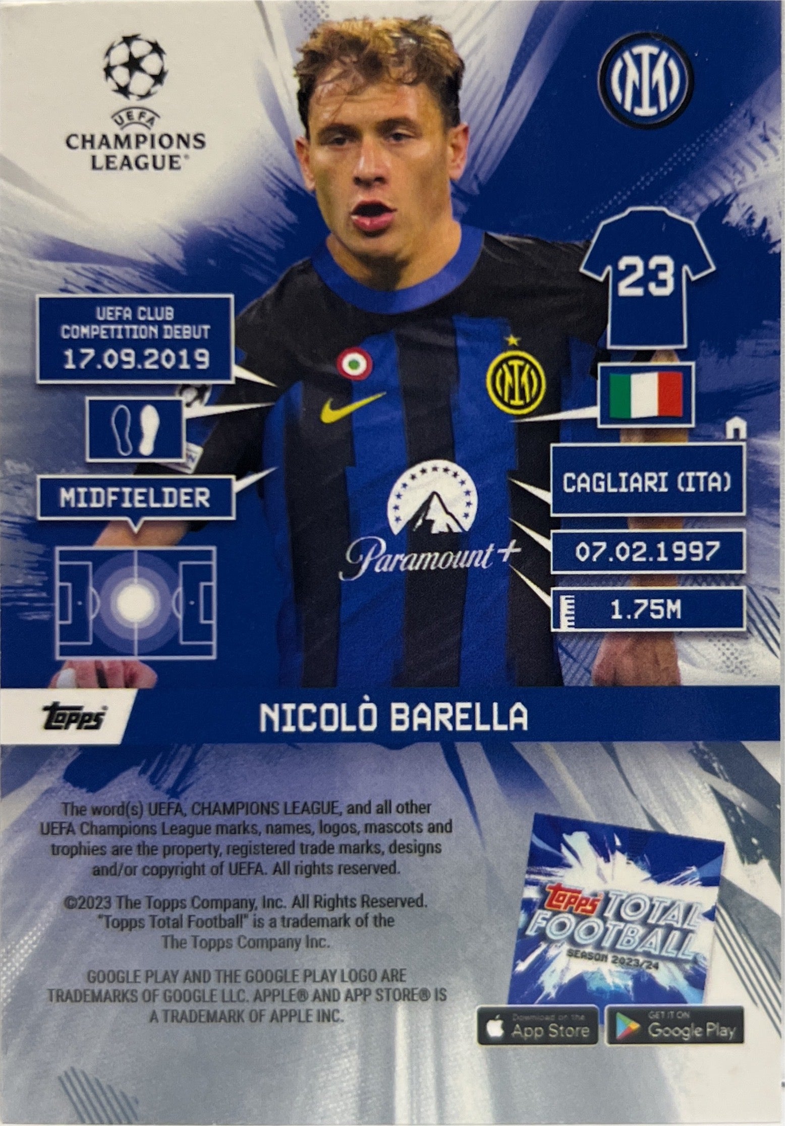 Nicolo Barella 7/25 Inferno Topps Total Football 2023/24 FC Internazionale Milano