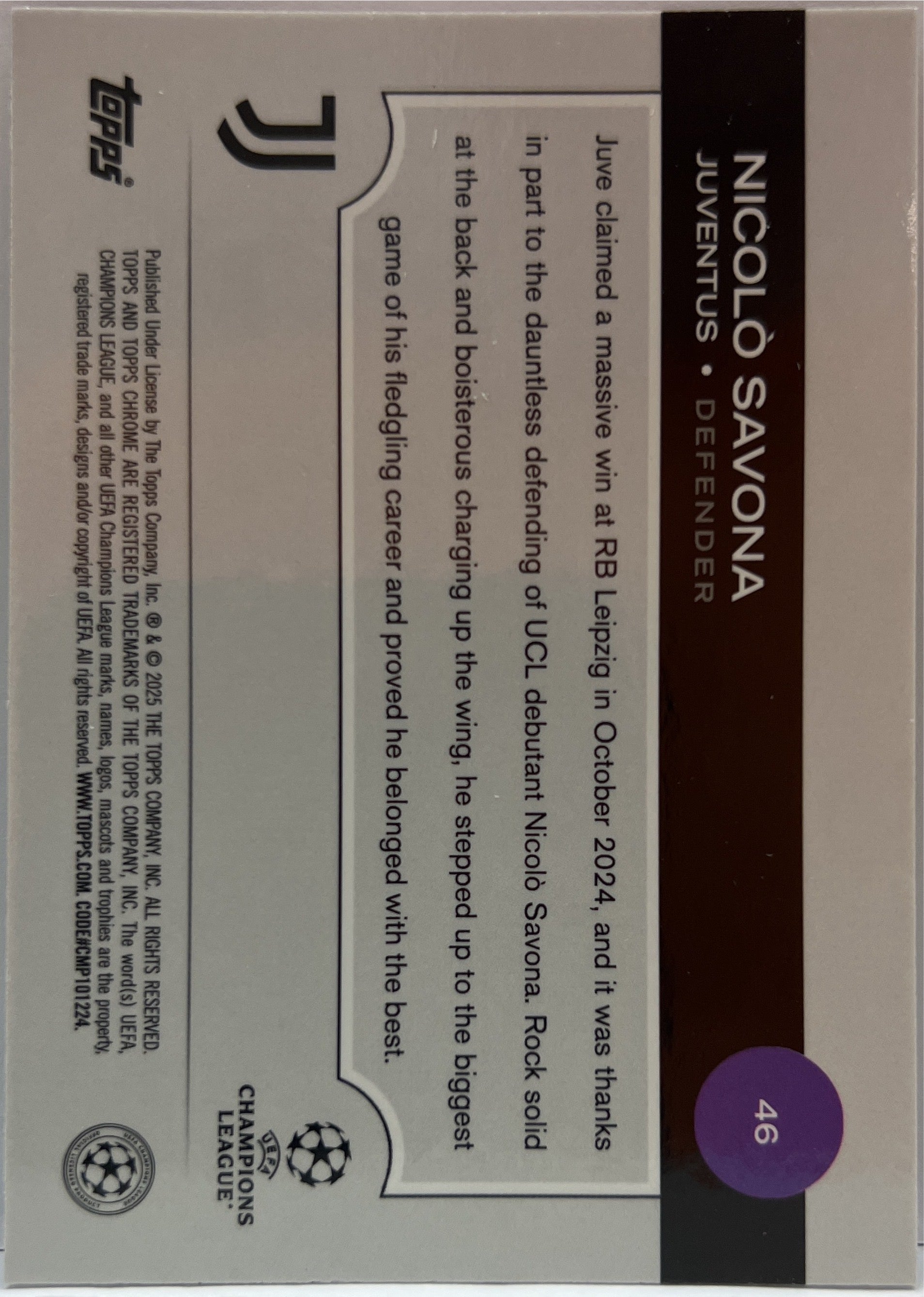 Nicolo Savona 104/199 Rookie Aqua Lava Topps Chrome UCC 2024/25 Juventus
