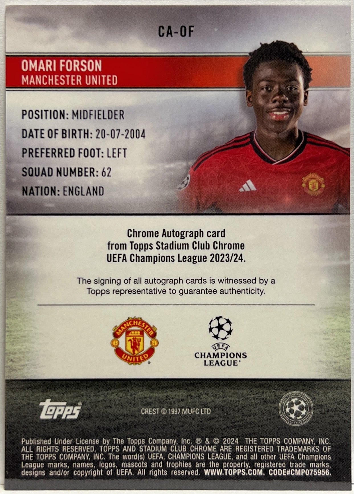 Omari Forson Rookie Autograph Topps Stadium Chrome 2023/24 Manchester United