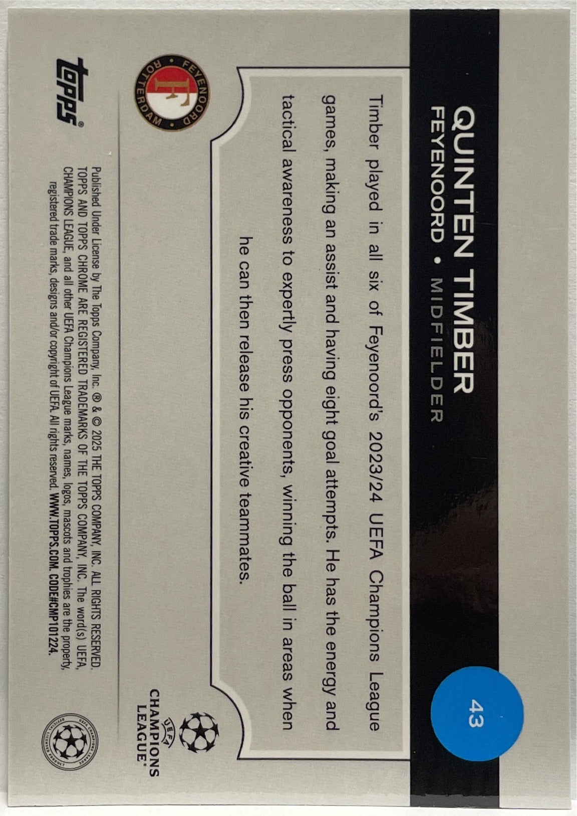 Quinten Timber 15/199 Rookie Aqua Lava Topps Chrome UCC 2024/25 Feyenoord