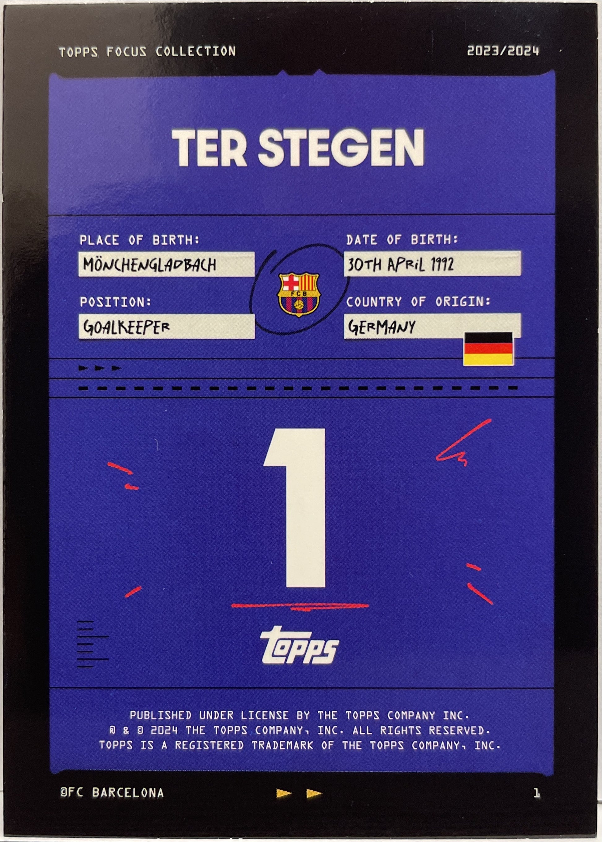 Ter Stegen 6/75 Blue Topps Focus Barcelona 2023/24
