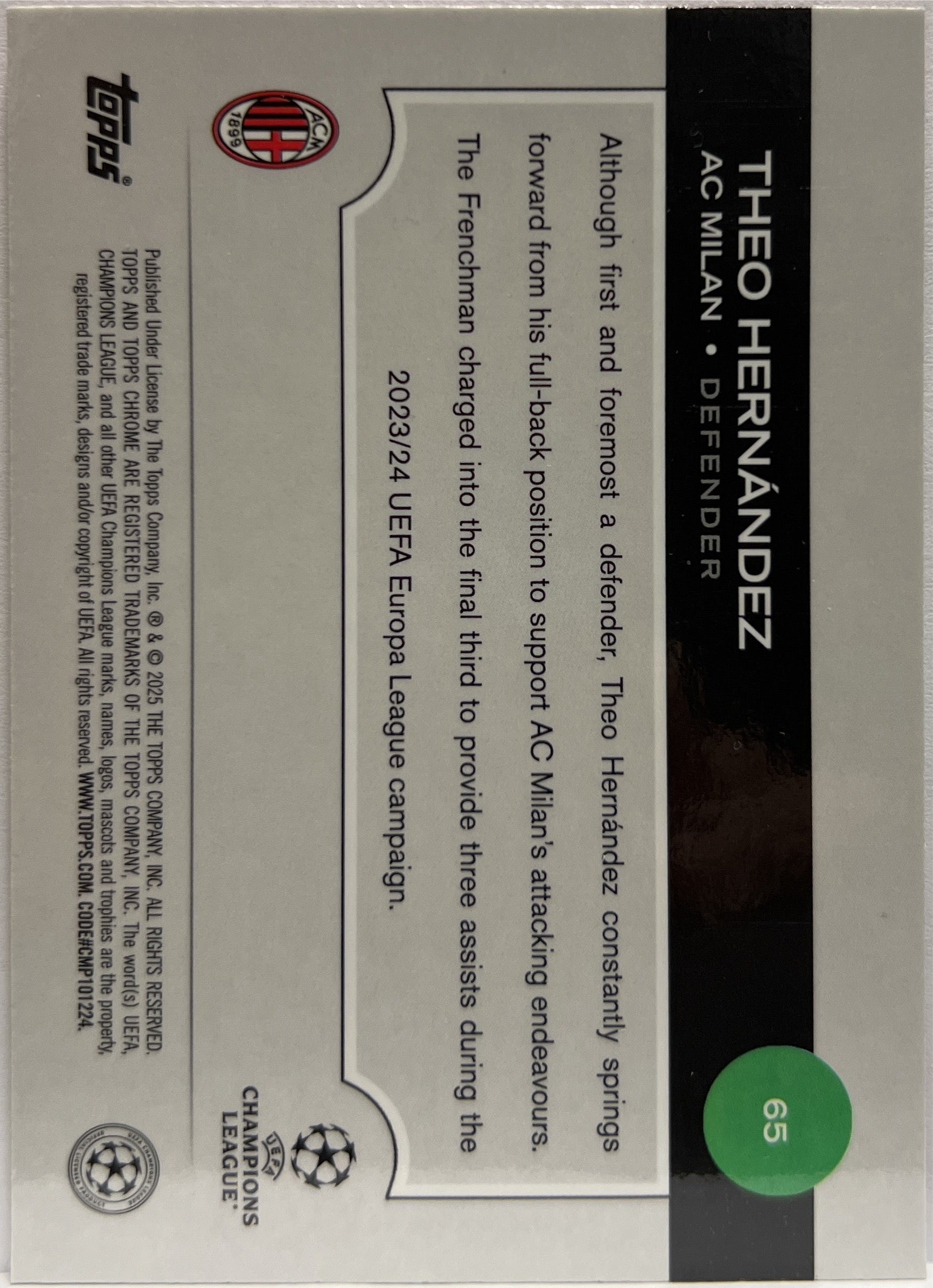 Theo Hernandez 210/250 Pink Topps Chrome UCC 2024/25 AC Milan