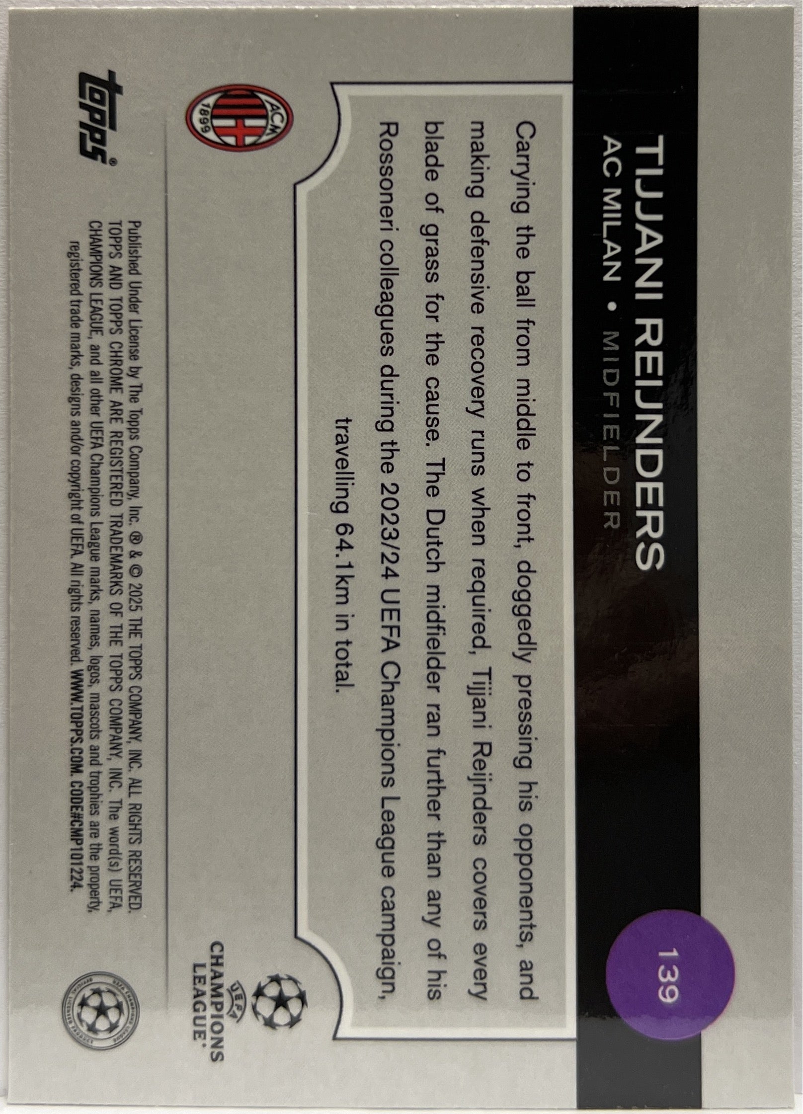 Tijjani Reijnders 19/250 Pink Lava Topps Chrome UCC 2024/25 AC Milan