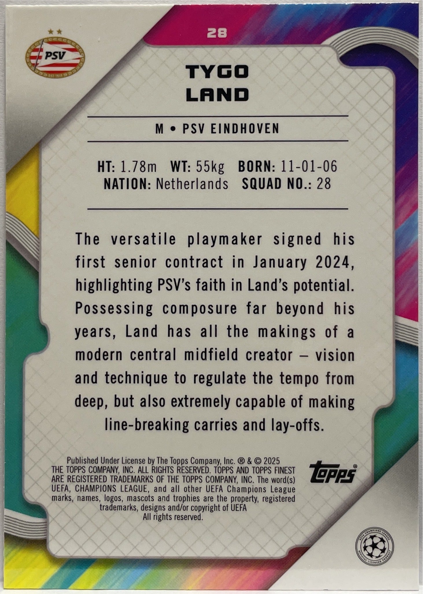 Tygo Land 30/275 Rookie Sky Blue Topps Finest UCC 2024/25 PSV Heindhoven