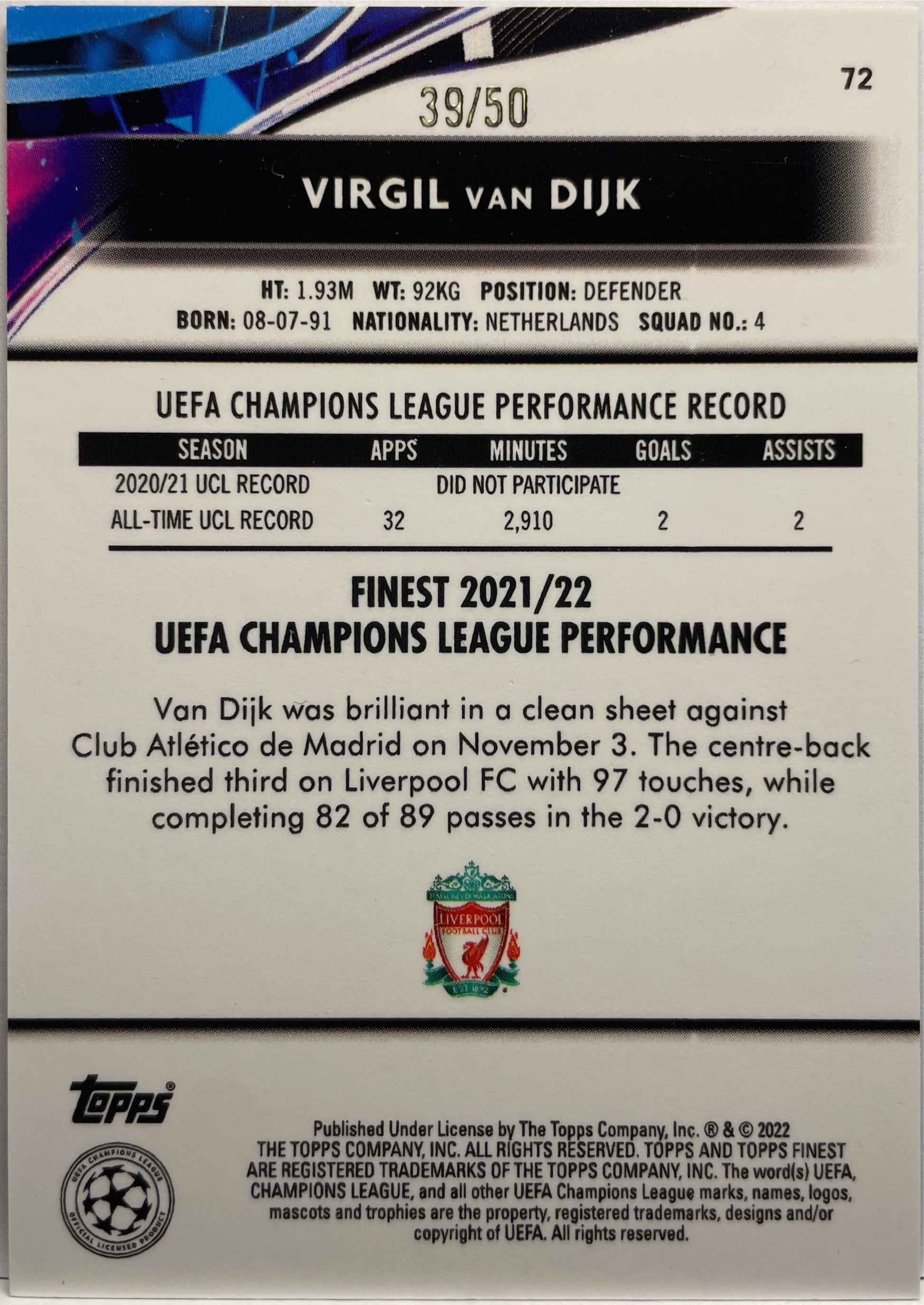 Virgil Van Dijk 39/50 Topps Finest UCL 2021/22 Liverpool FC