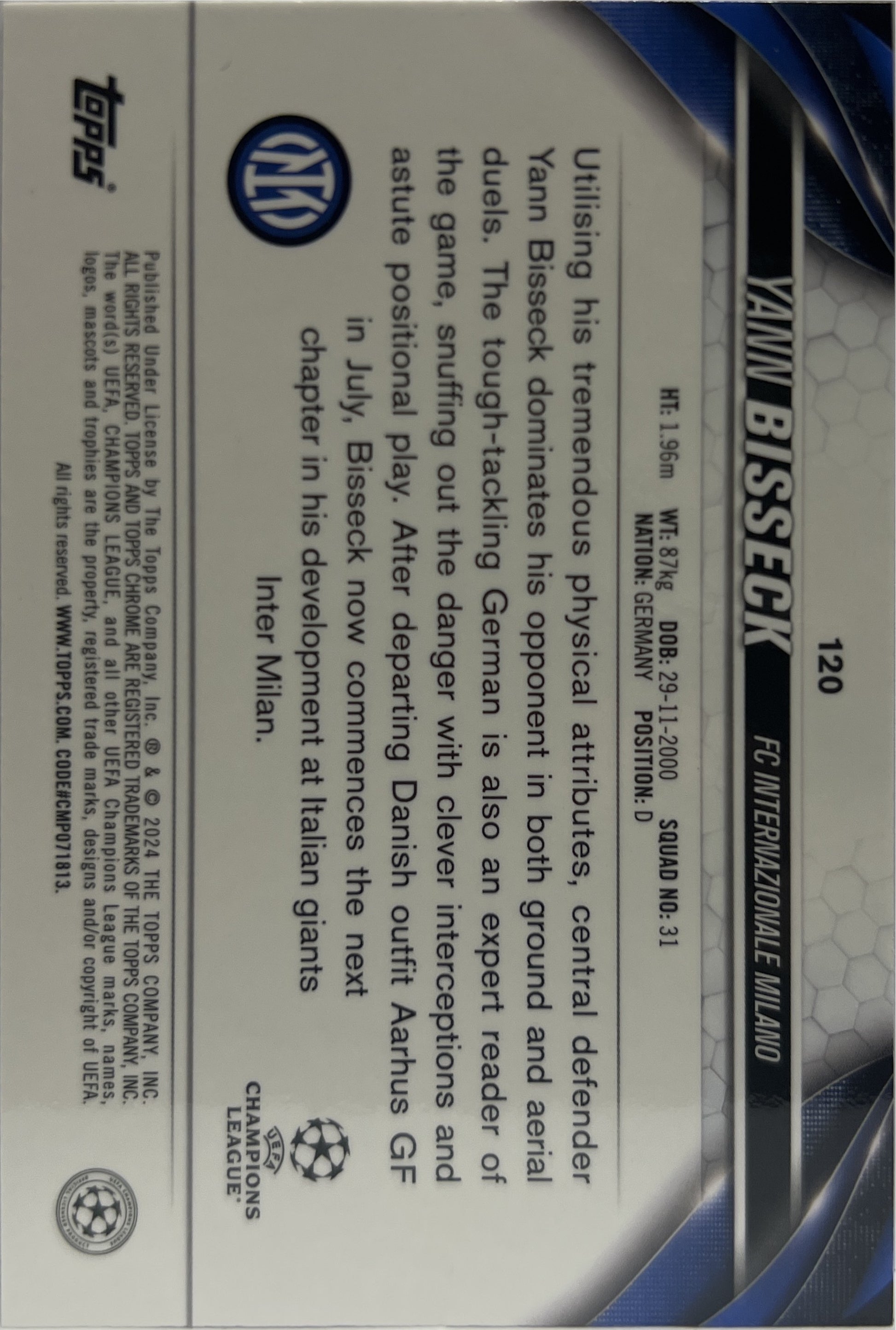 Yann Bisseck 89/225 Rookie Night Vision Topps Chrome UCC 2023/24