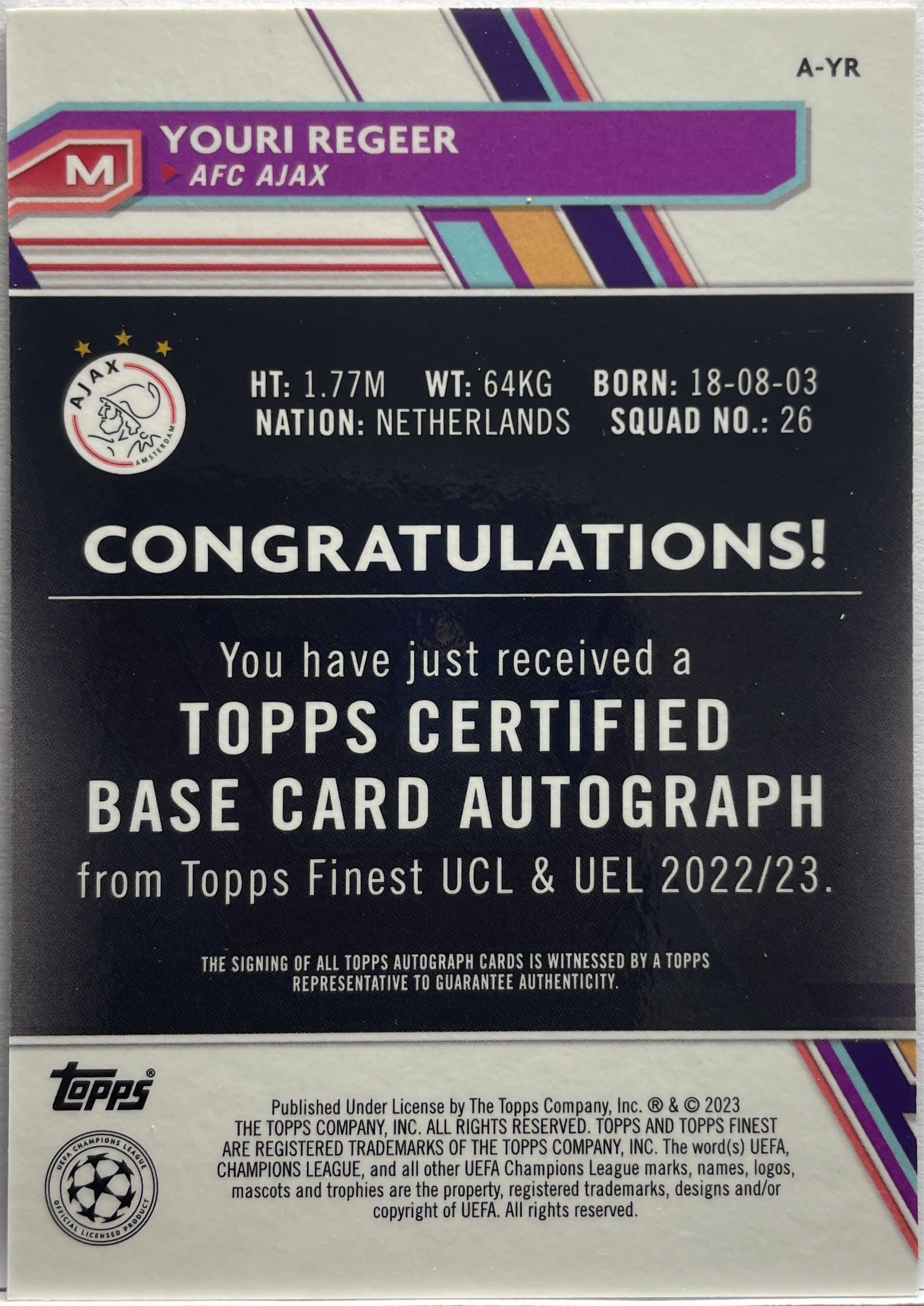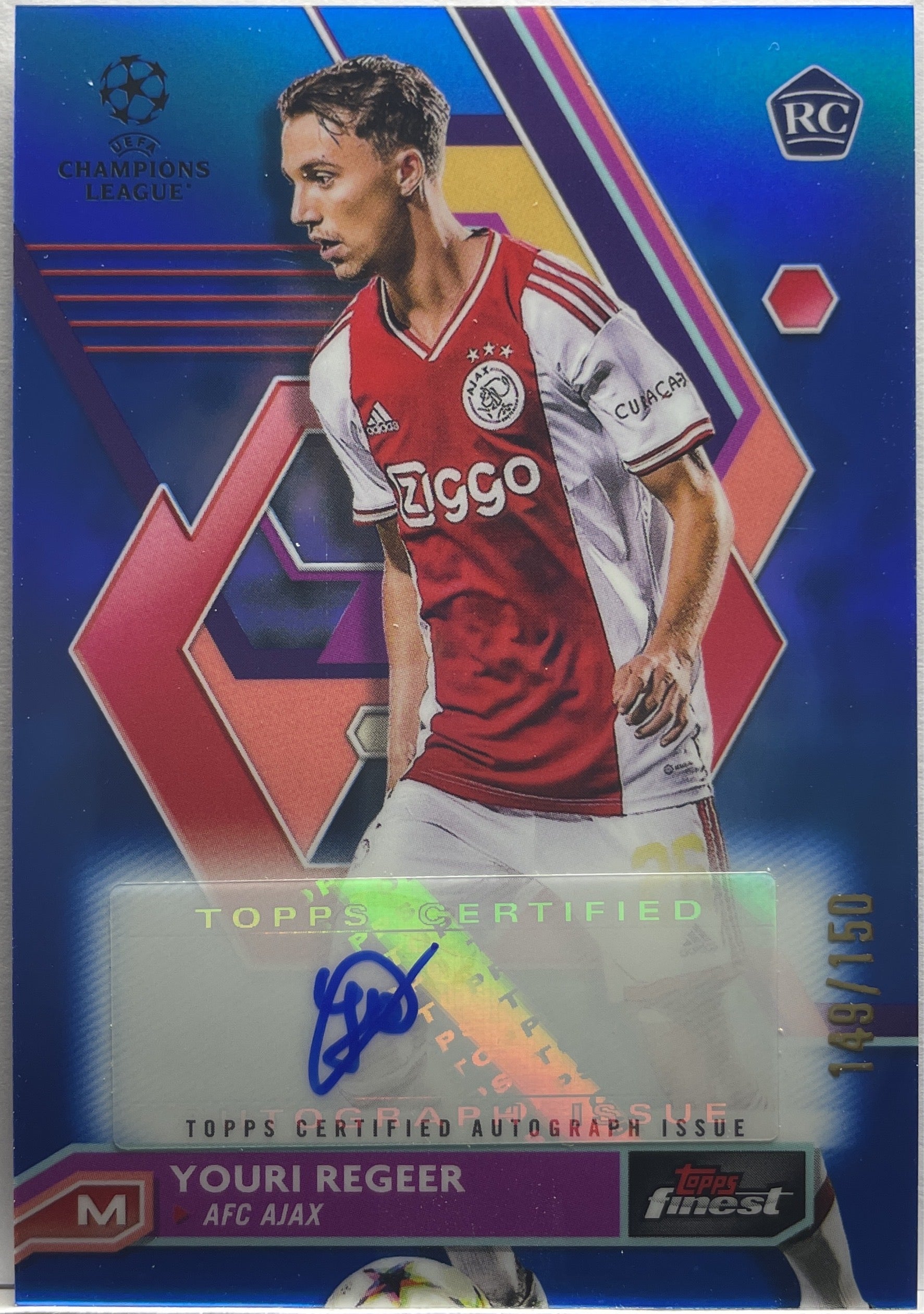 Youri Regeer 149/150 Rookie Autograph Blue Topps Finest UCC 2022/23 AFC Ajax