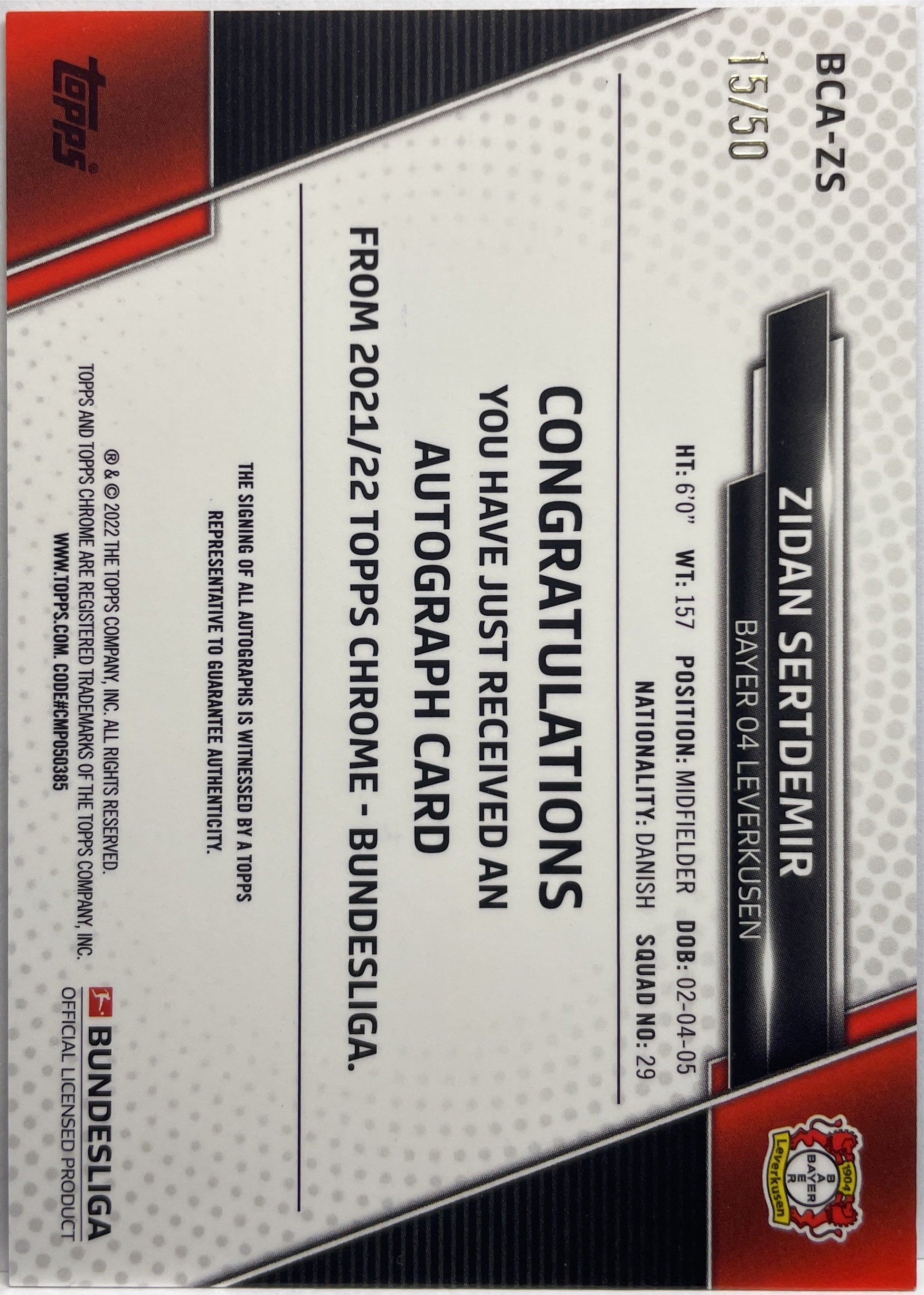 Zidan Sertdemir 15/50 Rookie Autograph Topps Chrome Bundesliga 2021/22 Bayern 04 Leverkusen