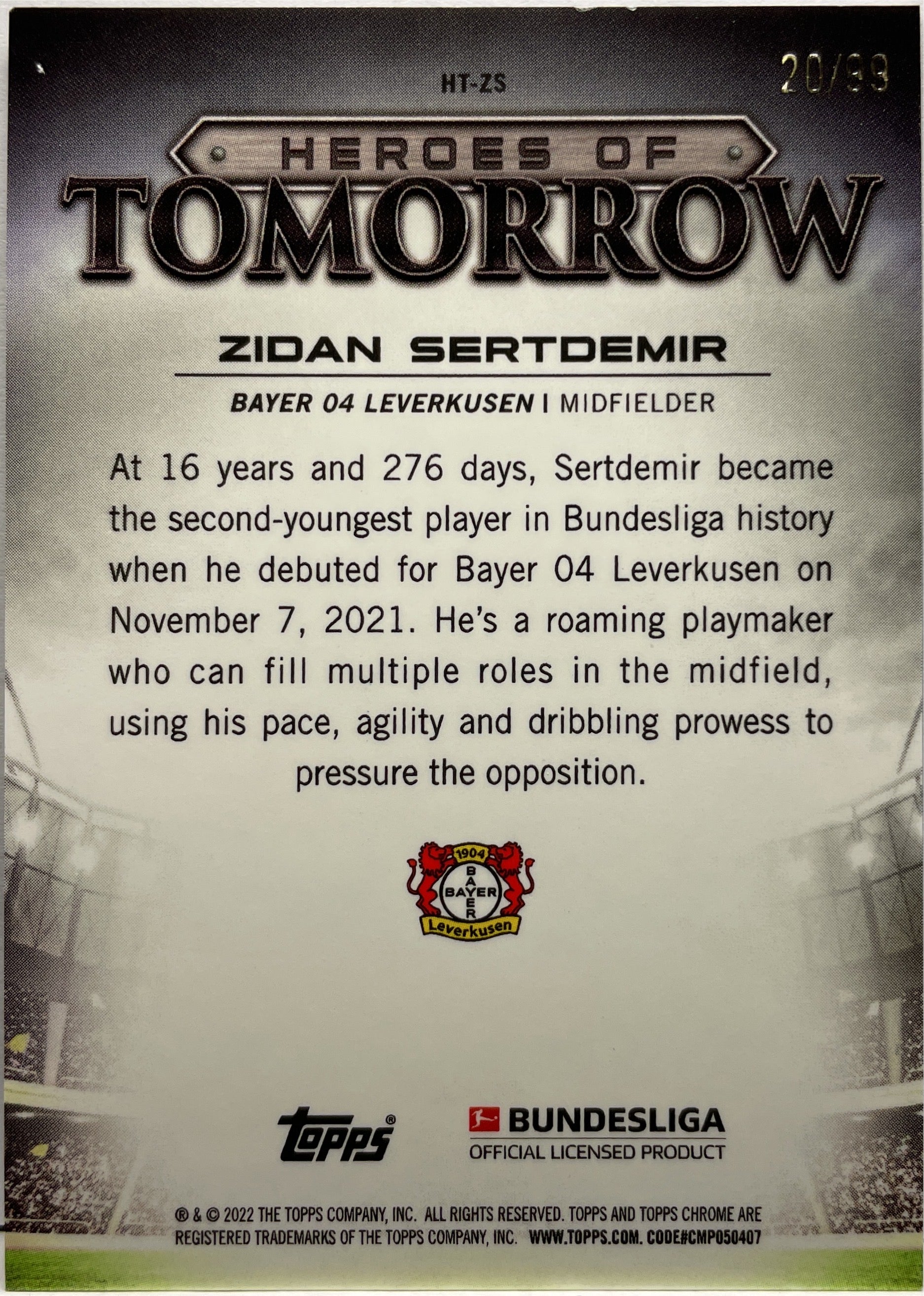 Zidan Sertdemir 20/99 Rookie Heroes Of Tomorrow Topps Chrome Bundesliga 2021/22 Bayer 04 Leverkusen